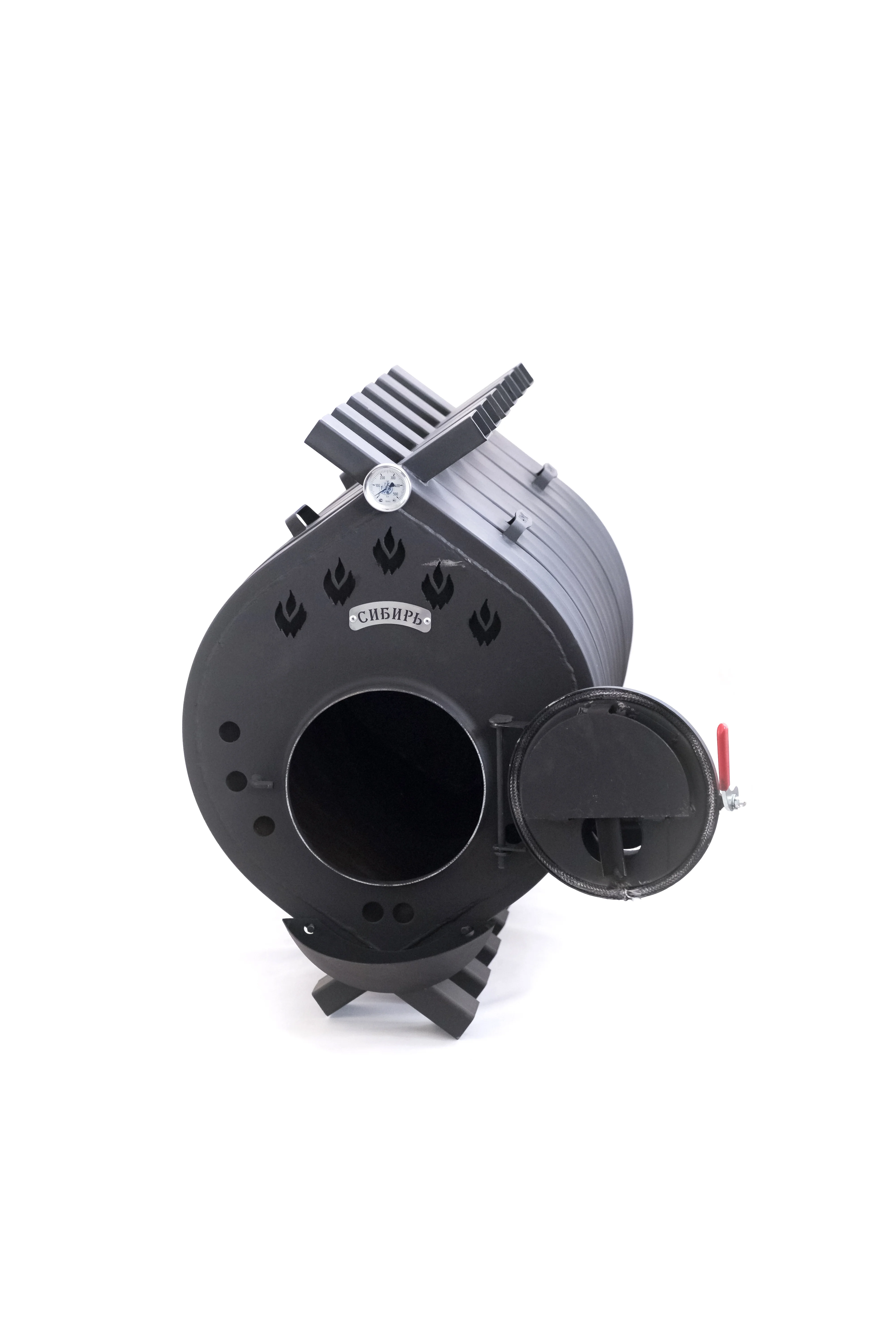 Воздухогрейная печь "Сибирь БВ" - 720 - это самый мощный нагревательный прибор, функционирующий на дровах в линейке воздухогерйных печей марки "Сибирь". Печь представляет собой цельнометаллическую конструкцию, состоящую из 12-ти соединенных между собой металлических труб прямоугольной формы, обеспечивающую естественную конвекцию.Печь "Сибирь БВ" - 720 способна в течение короткого периода времени нагреть воздух, равномерно его распределить по всему периметру помещения и создать комфортные условия пребывания внутри. Прототипом создания данной модели в производственной линейке завода "НМК" была аналогичная канадская отопительная печь, которая из-за высокой стоимости и множества недостатков, отсутствовала на российском рынке. Конструкторы завода "НМК" модернизировали данную печь, усовершенствовали конструкцию внутренних элементов и создали удобную печь с Сибирским характером. Воздухогрейная печь "Сибирь БВ" - 720 предназначена для качественного воздушного отопления жилых и производственных помещений, дач, гаражей, теплиц, мастерских и сушильных камер объемом от 480 до 720 м3. Номинальная мощность данной печи составляет 27 кВт. В конструкции данной печи также увеличена поверхность теплоотдачи и решена проблема интенсивного инфракрасного излучения при номинальной мощности ее эксплуатации. Холодный воздух, из отапливаемого помещения, за счет конвекции поступает в нижние отверстия теплообменных труб, а через верхние возвращается в помещение нагретым до температуры от 60 до 80 градусов.Таким образом, воздух равномерно нагревается и перемешивается по всему объему помещения. Воздухогрейная печь "Сибирь БВ" - 720 имеет двухкамерную топочную камеру, в которой методом тлеющего горения в две фазы происходит сжигание топлива и дожигаются печные газы. Далее печные газы, образовавшиеся от тления дров в нижней (первичной) камере поступают в верхнюю (вторичную) камеру, где дожигаются за счет подачи в нее, через специальные инжекторы подогретого воздуха из отапливаемого помещения.В режиме основного горения за счет тления топлива, одной полной закладки дров хватает на 8 – 10 часов непрерывной работы, в зависимости от плотности, влажности топлива и степени нагрева помещения. Перегородка, разделяющая первичную и вторичную камеры также способствует достижению оптимальной температуры верхних концов теплообменных труб. Загрузка топлива в печь производится через загрузочную дверцу, имеющую оптимальные размеры, что позволяет загружать в печь даже крупные круглые поленья. Эксцентриковый замок на ручке дверцы обеспечивает ее надежное и плотное запирание. На загрузочной дверце расположен регулятор заслонки поддувала, с помощью которого можно регулировать интенсивность сжигания топлива. Режим дожигания печных газов, выделяющихся из топлива, устанавливается регулятором заслонки дымохода и подбирается опытным путем в зависимости от конструкции дымохода. Зольник предохраняет от возможного падения раскаленных частичек топлива на пол помещения.