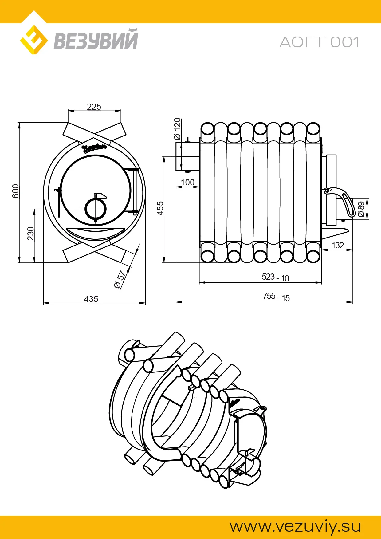 Печь отопительная ВЕЗУВИЙ АОГТ 001 предназначена для обогревабытовых нежилых и промышленных помещений. Печь рассчитана на обогрев помещенийобъёмом до 150 кубических метров.