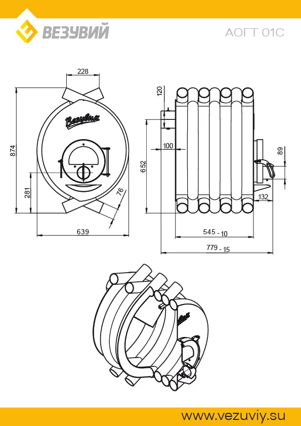 Печь отопительная ВЕЗУВИЙ АОГТ 01 С предназначена для обогрева бытовых нежилых и промышленных помещений. Печь рассчитана на обогрев помещений объёмом до 200 кубических метров.