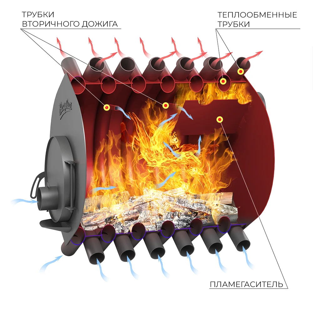 Две камеры сгорания, нижняя камера газификации и верхняя камера дожига газов, обеспечивают практически полное сгорание топлива и получение максимального количества энергии во время работы печи.