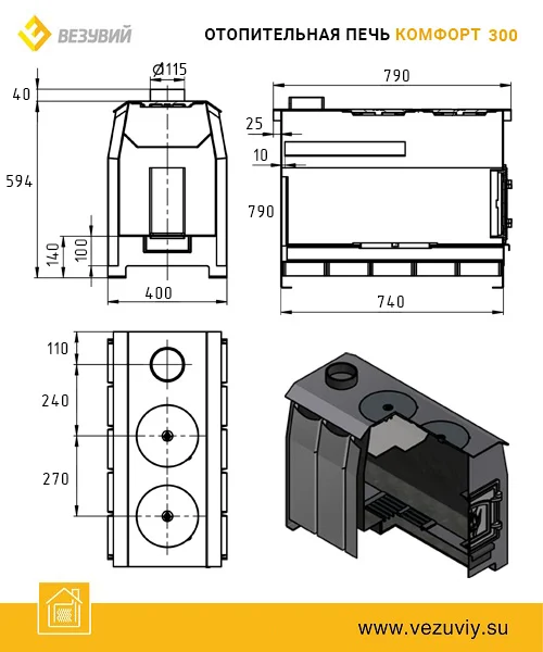 Печь Везувий "Комфорт 300" (ДТ-3С) выполнена в эргономичном дизайне, компактна по своим размерам, окрашена эмалью черного цвета, что позволяет ей органично вписаться в интерьер любого помещения, долго обогревать дом, привнося в него тепло и уют.
