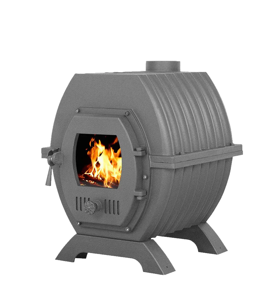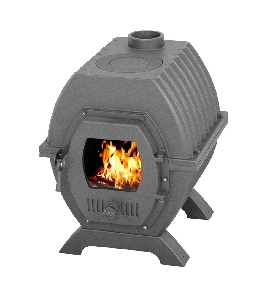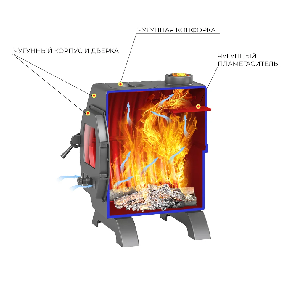 - Чугунная топочная дверь с жаростойким стеклом и системой регулировки режимов горения.