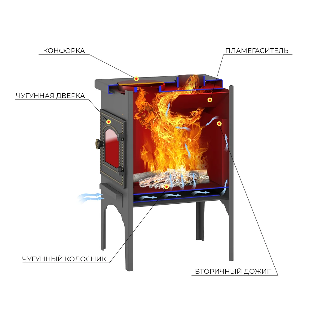 Верхнюю горизонтальную поверхность можно использовать для приготовления пищи. Печь укомплектована чугунным колосником и чугунной негерметичной дверцей Везувий ДТ-4. Печь облицована керамической плиткой для лучшего распределения тепла.