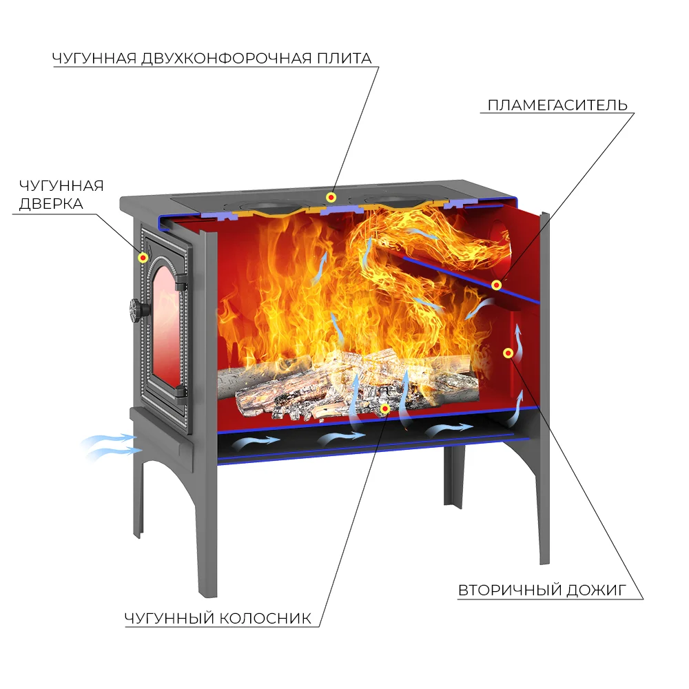 Верхнюю горизонтальную поверхность можно использовать для приготовления пищи. Печь укомплектована чугунным колосником и чугунной негерметичной дверцей Везувий ДТ-4. Печь облицована керамической плиткой для лучшего распределения тепла.