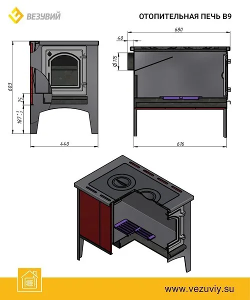 Отопительная печь «Везувий» В9С предназначена для установки в различных хозяйственных помещениях небольшого размера, садовых домиках, жилых помещениях временного проживания. Печь изготовлена из особопрочной котловой стали марки 09Г2С.