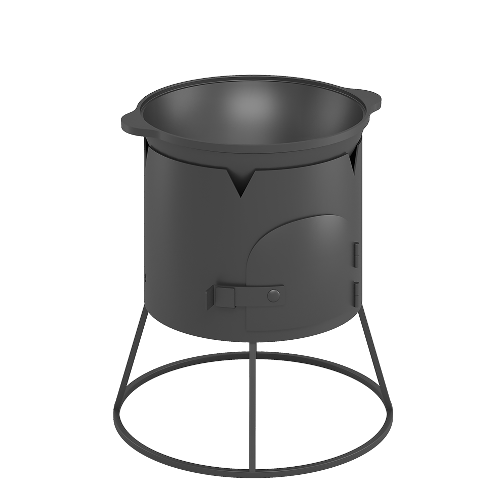 Конструкция печи состоит из цилиндрической топки с дном и вырезом для подачи дров и подставки, поднимающей печь на удобную для работы с ней высоту.