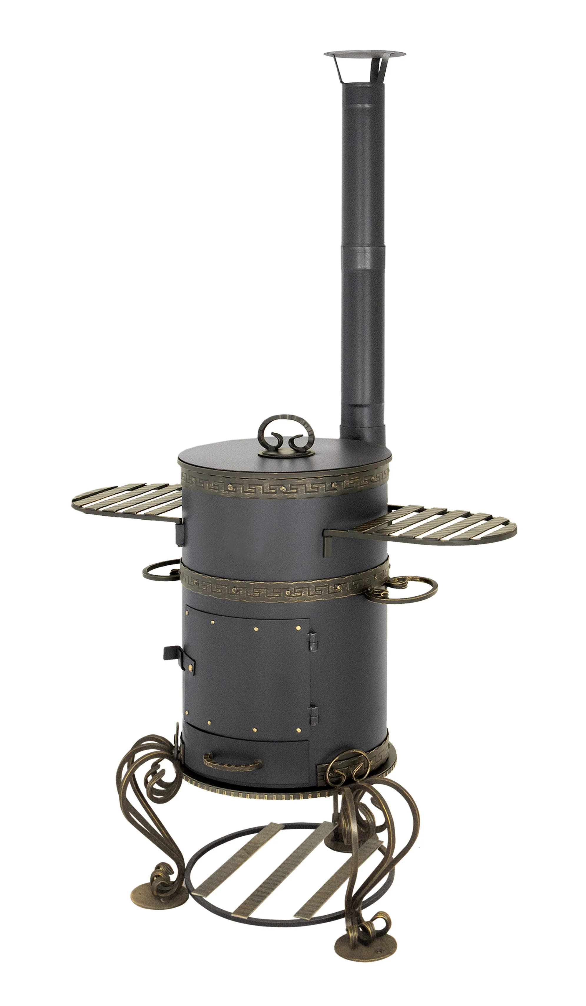 Печь под казан для приготовления еды на свежем воздухе. Объем казана 12 литров хватает для того, чтобы накормить обедом всех членов большой семьи. С двух сторон печь оборудована двумя полочками. Внешне они напоминают крылья шмеля, за что печь и получила свое название.Печь оснащена вытяжной трубой самоварного типа. Благодаря этому образующийся дым поднимается высоко в воздухе и не мешает окружающим.Колосниковая решётка и выдвижной зольный ящик позволяет легко и быстро удалять золу при горящей печи. Также его можно использовать для регулирования интенсивности горения дров в топке