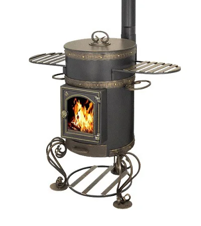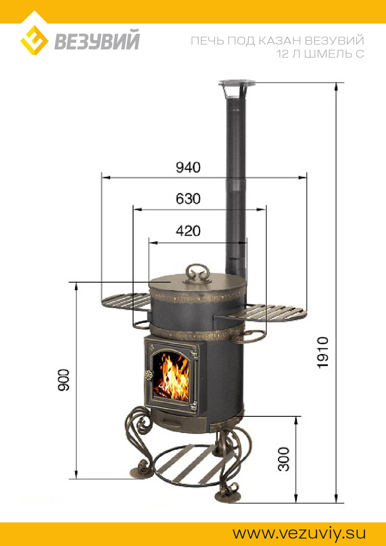 Печь под казан для приготовления еды на свежем воздухе. Объем казана 12 литров хватает для того, чтобы накормить обедом всех членов большой семьи. С двух сторон печь оборудована двумя полочками. Внешне они напоминают крылья шмеля, за что печь и получила свое название. Печь оснащена вытяжной трубой самоварного типа. Благодаря этому образующийся дым поднимается высоко в воздухе и не мешает окружающим. Колосниковая решётка и выдвижной зольный ящик позволяет легко и быстро удалять золу при горящей печи. Также его можно использовать для регулирования интенсивности горения дров в топке.