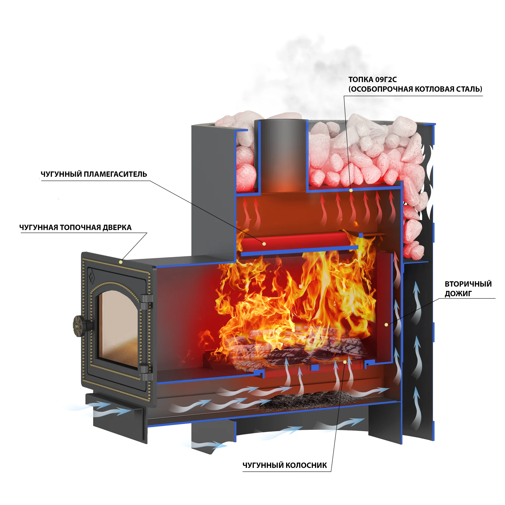 - Конвекционно-вентилируемый кожух, вмещающий до 50 кг камней.