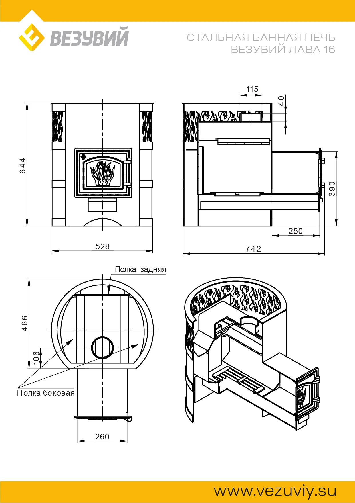 Стальная банная печь серии Лава усовершенствованной конструкции работает на дровах и предназначена для нагрева пространства парной и получения пара. Печь Везувий Лава 16 (ДТ-3С) рассчитана на объем парной 8-18 кубометров.