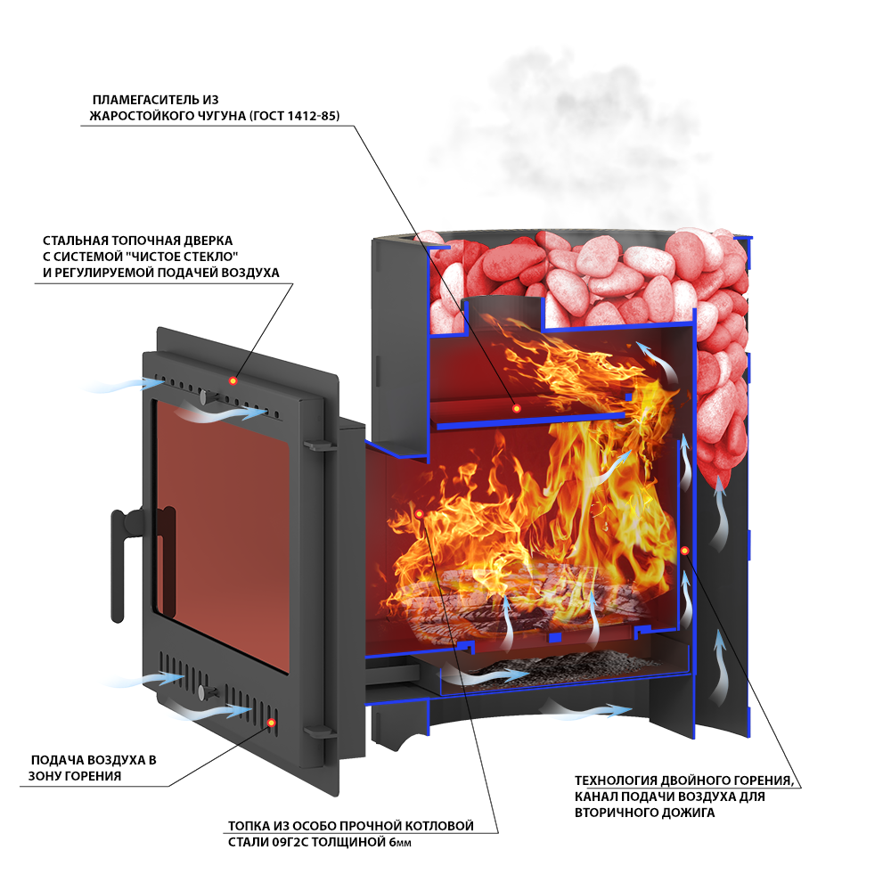 В печи обеспечен дожиг вторичных газов посредством широкого П-образного профиля на задней поверхности топки, который, доставляя воздух в зону активного горения, увеличивает КПД печи и дополнительно усиливает заднюю стенку печи.