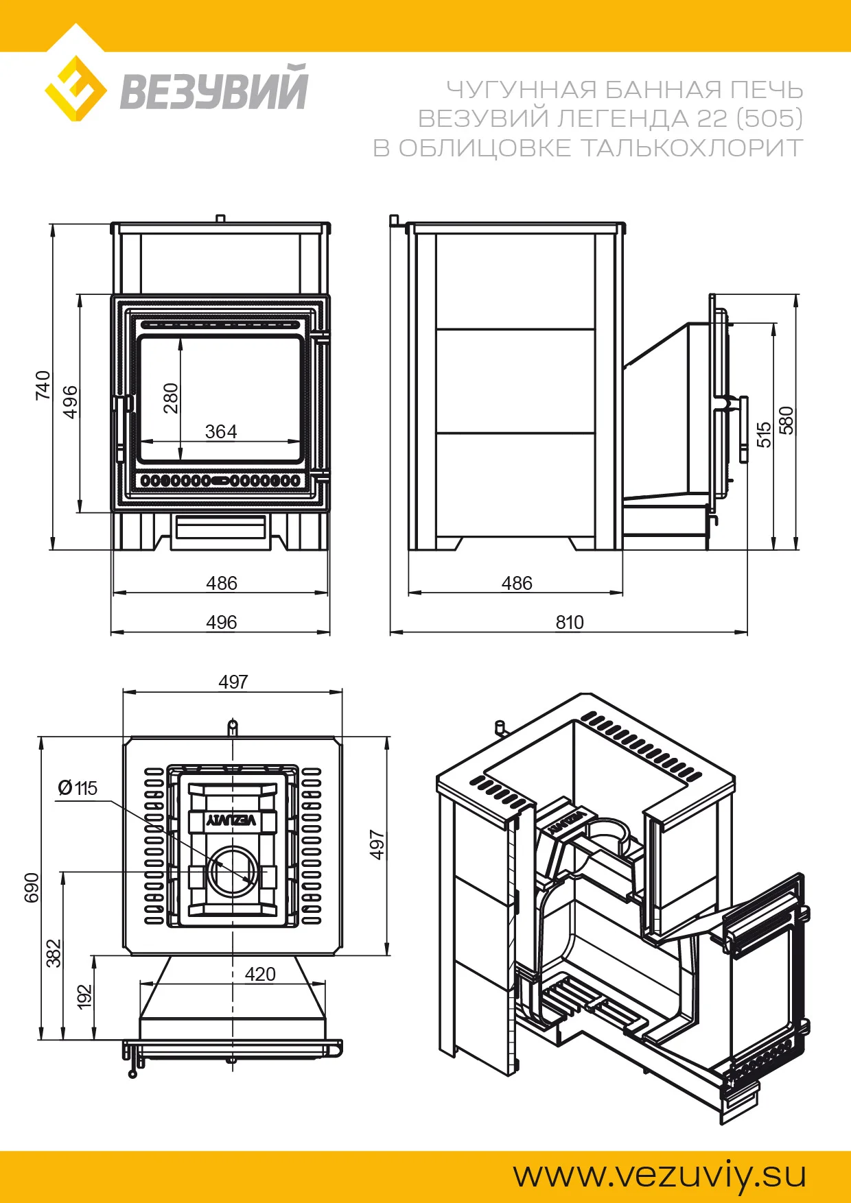 Преимущество печи в том, что топка печи состоит из 3-х ЧУГУННЫХ элементов. На стыке между ними используется керамический шнур с рабочей температурой 1200 градусов. То есть топка печи абсолютно герметична! Для фиксации деталей между собой применяется болтовое соединение, что даёт 100% гарантию безопасности при эксплуатации.Конвекционно–вентилируемая облицовка, изготовленная из экологически чистой горной породы , который обладает большой теплоёмкостью, что позволяет камню в короткие сроки нагреваться и максимально долго удерживать стабильную температуру в парильном помещении, а также гасить жёсткое инфракрасное излучение Камень обладает исключительными лечебными свойствами: помогает при головных болях, при нестабильном артериальном давлении, при простудных заболеваниях, воспалительных процессах в почках и пищеварительной системе, снимает повышенную возбудимость и нервозность, сглаживает эмоциональные всплески. Облицовка из натурального камня при нагреве способна аккумулировать тепло, что гарантирует максимально равномерный прогрев и сохранение тепла. Банная печь ЛЕГЕНДА 22 (505) укомплектован чугунной каминной дверцей Везувий 505 с большим жаропрочным стеклом «SCHOTT ROBAX», с оборудованной системой самоочистки, что позволяет визуально контролировать горение и любоваться видом живого огня. Данная печь рассчитана на объем парильного помещения 12-24 м3.