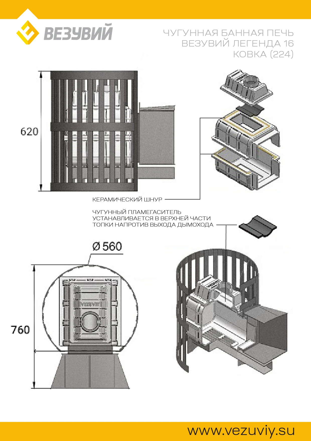 Банная чугунная печь Легенда Ковка 16 (224) укомплектована чугунной герметичной дверцей Везувий 224 с жаропрочным стеклом «SHOT ROBAX». Конвекционно-вентилируемый кожух "Ковка" изготовлен из металлической текстурированной полосы покрашенной термостойкой краской и покрытая патиной «Бронза».