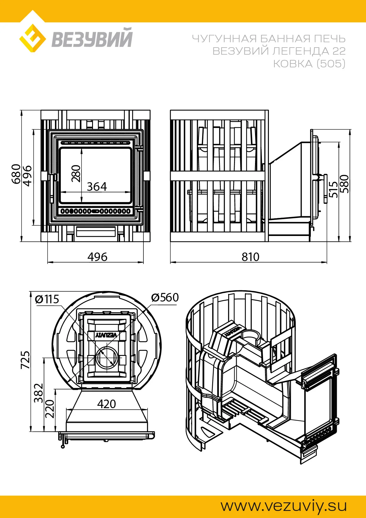 Банная чугунная печь Легенда Ковка 22 (505) укомплектована чугунной герметичной дверцей Везувий 505 с жаропрочным стеклом «SCHOTT ROBAX». Конвекционно-вентилируемый кожух "Ковка" изготовлен из металлической текстурированной полосы покрашенной термостойкой краской и покрытая патиной «Бронза».