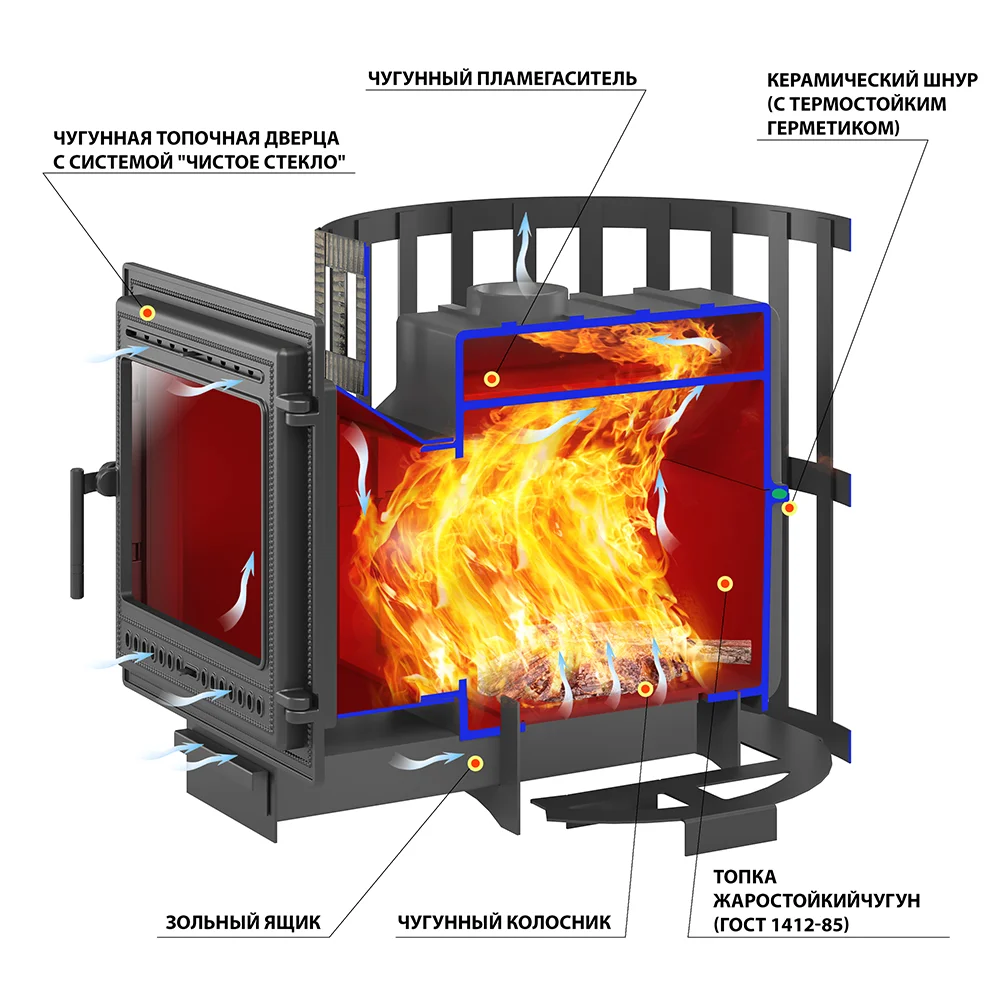 Тоннель длиной двадцать один сантиметр позволит хорошо изолировать стену между парилкой и предбанником как при помощи бруса, так и при помощи кирпича или блоков. Цельно литая чугунная дверца сохраняет свою форму при нагревании и предотвращает задымление помещения. Крепление дверок к топочному тоннелю – болтовое, позволяющее при необходимости снимать и заменять дверку. Стык тоннеля и топки обработан термостойким герметиком, предупреждающим проникновение дыма в предбанник.