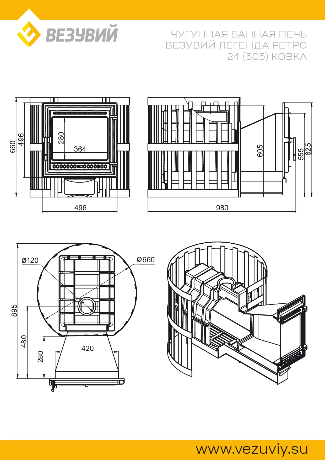 Банная чугунная печь Легенда Ретро 24 Ковка (505) укомплектована чугунной герметичной дверцей Везувий 505 с жаропрочным стеклом «SCHOTT ROBAX» и системой очистки стекла. Конвекционно-вентилируемый кожух "Ковка" изготовлен из металлической текстурированной полосы покрашенной термостойкой краской и покрытая патиной «Бронза».