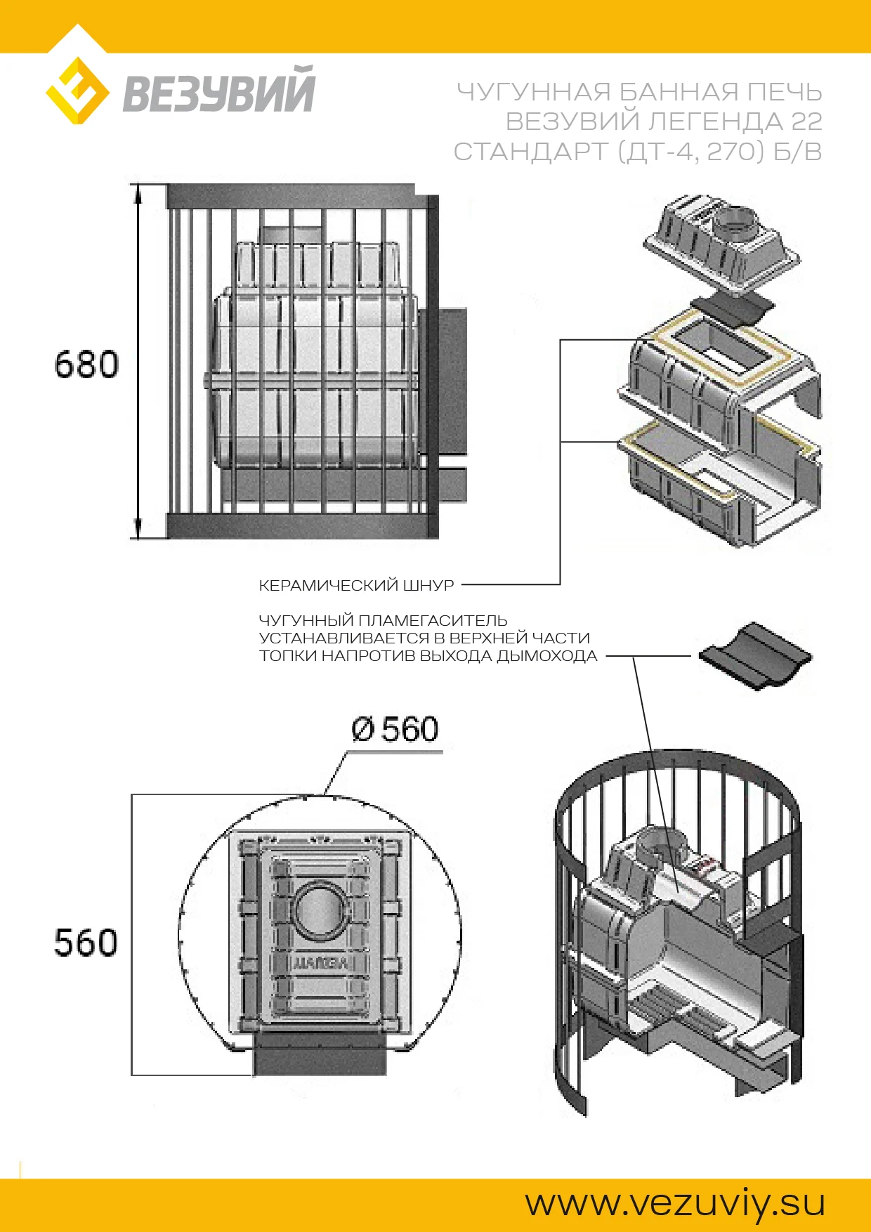 Банная чугунная печь Легенда Стандарт 22 (ДТ-4) укомплектована чугунной не герметичной дверцей Везувий ДТ-4. Конвекционно-вентилируемый кожух "Стандарт" изготовлен из металлического прутка диаметром 6 мм покрашенной черной термостойкой краской.