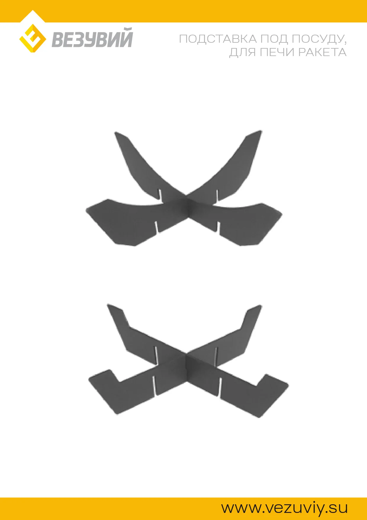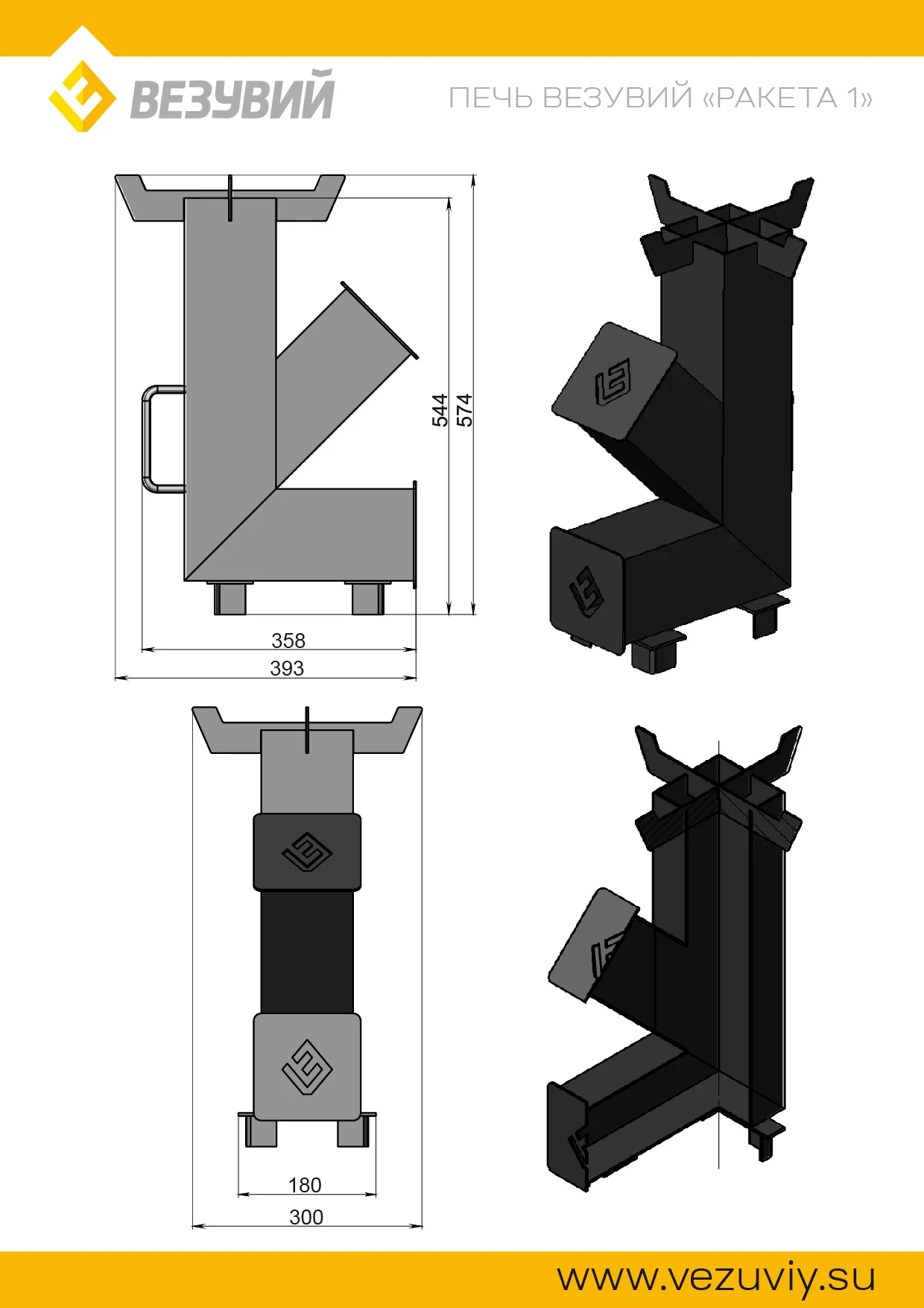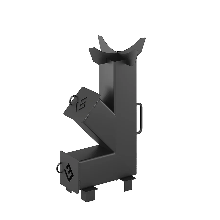 Печь Везувий «Ракета 1» — переносная походно-туристическая печь ракетного типа, предназначенная для нагрева воды и приготовления пищи в походных условиях. Свое название ракетные печи получили благодаря конструкции, внешне напоминающей ракету и гудящему звуку, появляющимся при слишком большом количестве воздуха подаваемого в топливник. В обычном режиме печь функционирует с едва слышимым шелестящим звуком.Конструктивно печь представляет из себя F-образную трубу. В верхний горизонтальный тоннель закладываются дрова. Тоннель приварен под углом, это обеспечивает самостоятельное перемещение дров вниз по мере горения (под действием силы тяжести). Зола в такой конструкции скапливается в нижнем горизонтальном тоннеле и не забивает топку, не нарушая при этом тягу и интенстивность горения, это, в свою очередь, ведет к более экономичному использованию дров.После растопки дров в F-образном канале возникает тяга, за счет которой интенсивность горения в ракетной печи возрастает по мере прогрева корпуса. Таким образом, принцип работы реактивной печи заключается в использовании энергии естественного потока восходящих продуктов горения. Чем выше температура стенок топливника, тем древесина горит интенсивнее, а пламя становится мощнее.Данная печь отличается своей экономичностью в потреблении дров и отдачей на выходе максимального количества тепла за счет реактивной тяги созданной самой конструкцией печи. Печь «Ракета 1» отлично подойдет для охотников, рыболов и любителей отдохнуть на природе, даче.Преимущества:- Тощина стали 3мм;- F-образная конструкция;Две подставки под посуду поставляются в комплекте. Казан продается отдельно.