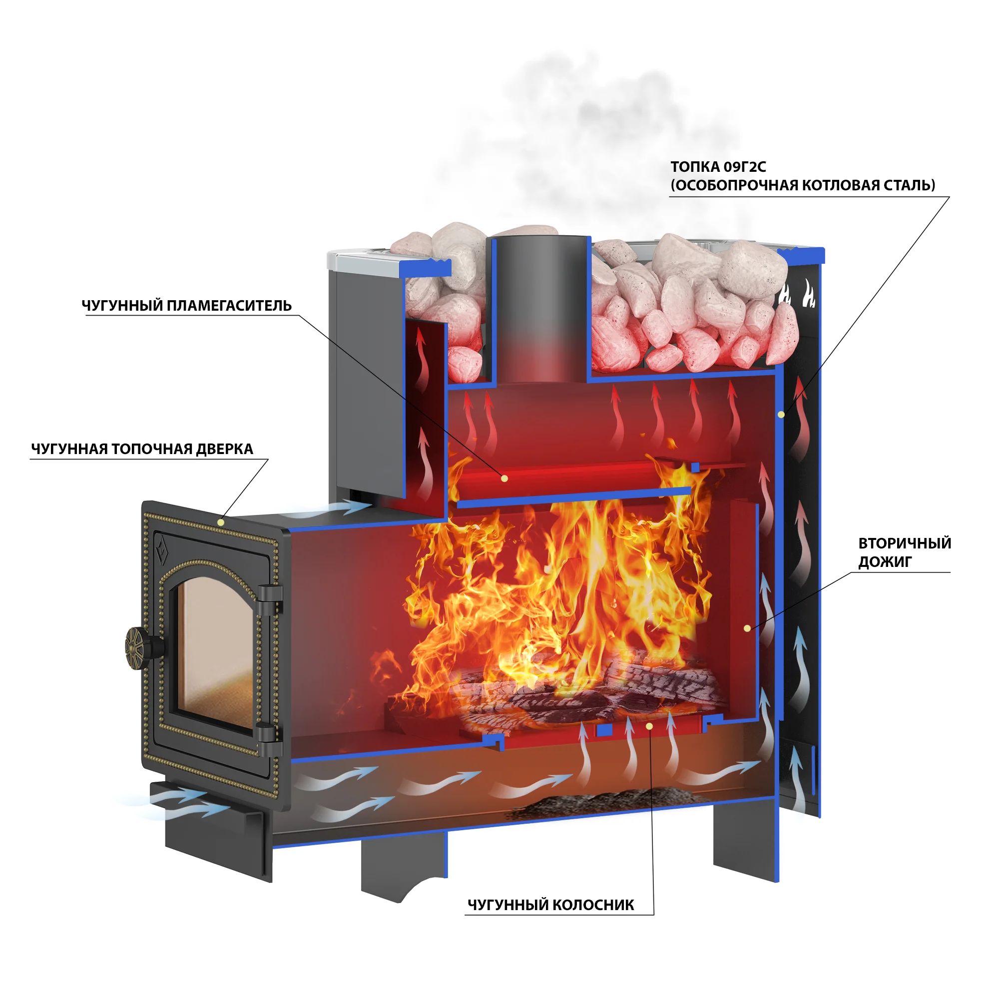Дверка, пламегаситель и колосник изготовлены из чугуна, что увеличивает их прочность и срок службы.
