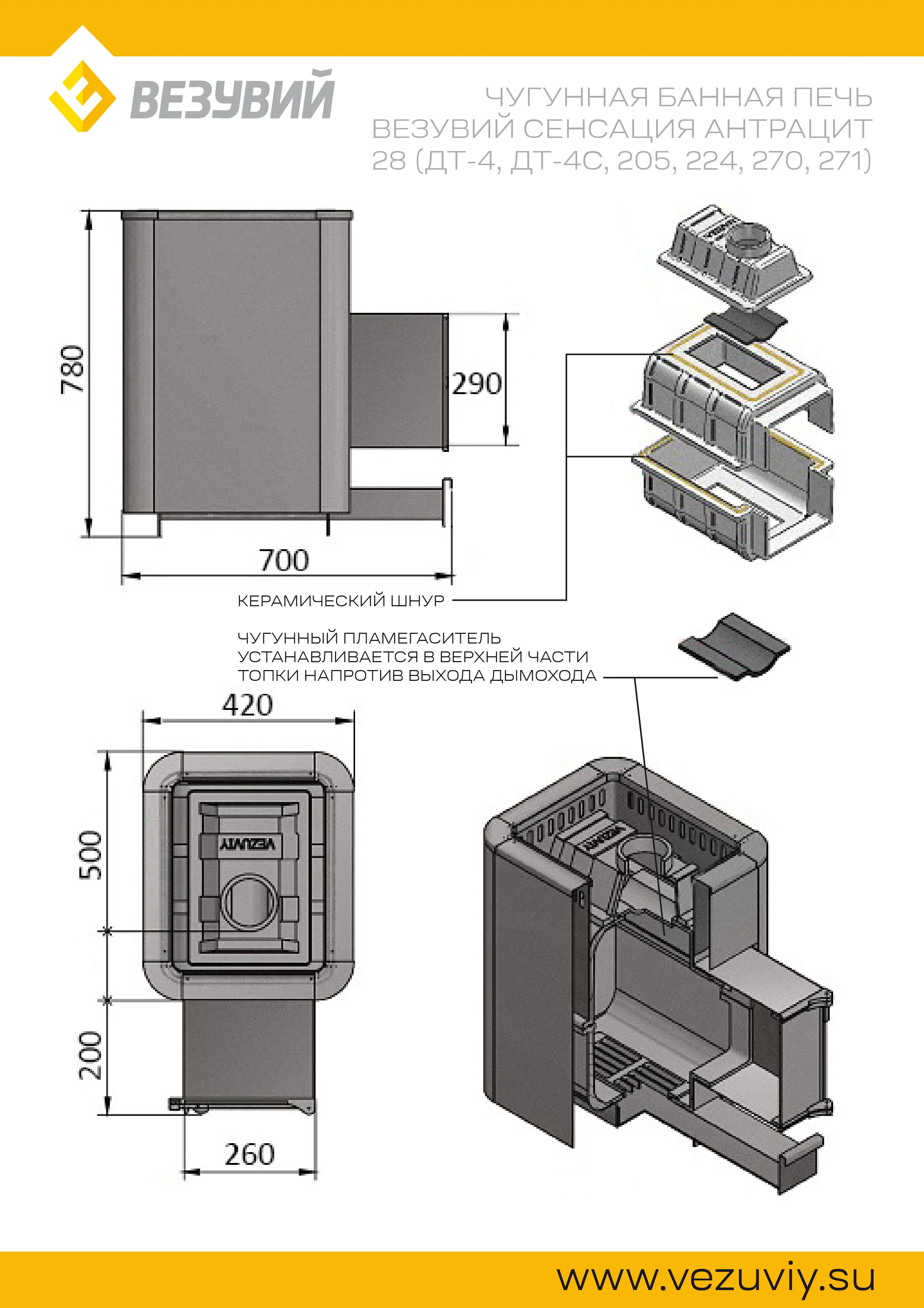 Банная чугунная печь Сенсация 28 (ДТ-4) укомплектована чугунной не герметичной дверцей Везувий ДТ-4.