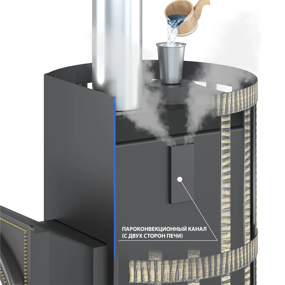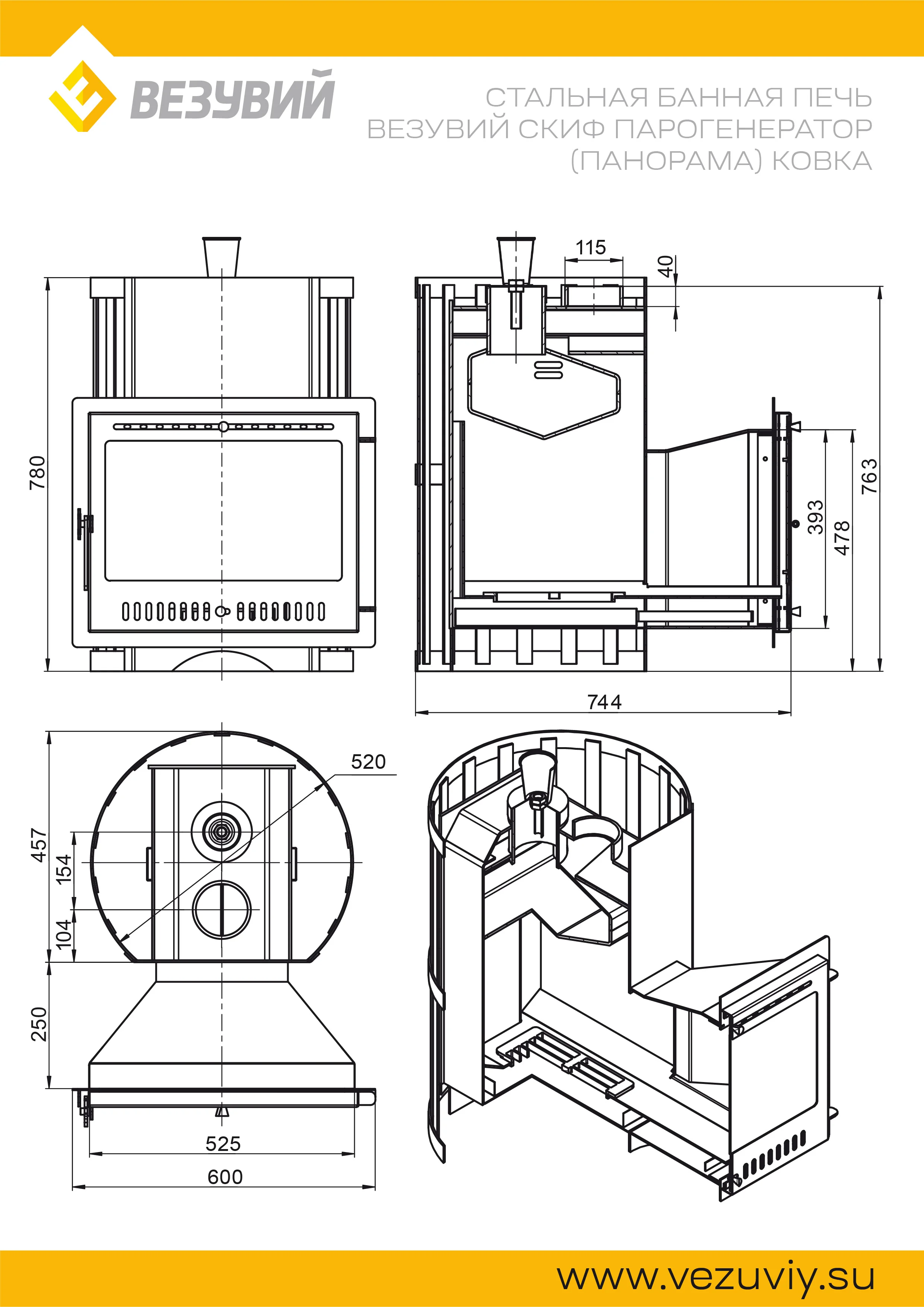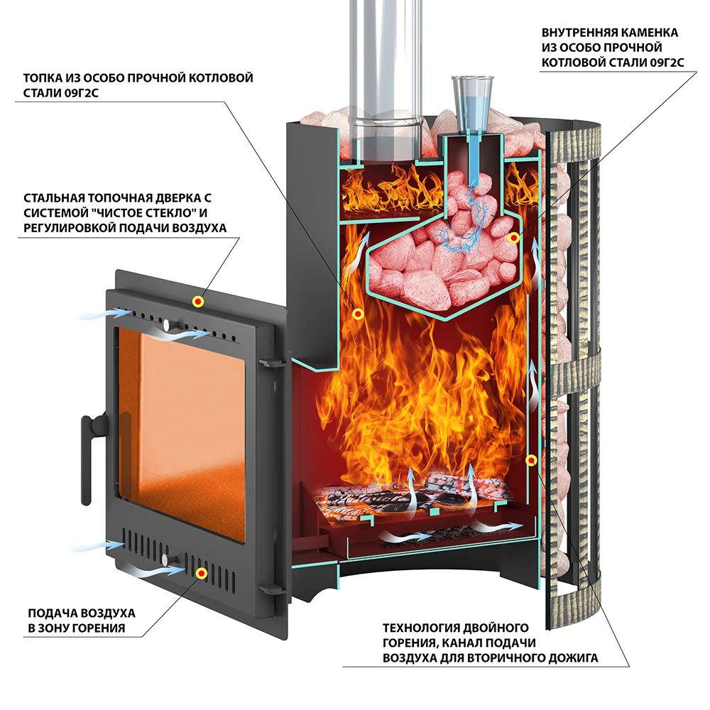 Печь изготовлена из особо прочной котловой стали 09Г2С, рассчитанной на работу при высоких температурах и давлении. Толщина стенок печи 4-6 мм. Топочный тоннель сделан из стали толщиной 4 мм, что позволяет топить дрова длиной более 50 см.Топка оснащена каналом для подачи воздуха на вторичный дожиг дымовых газов. Канал проходит по задней стенке топки снизу вверх и подаёт воздух для горения в верхние отделы топки. Такая конструкция повышает экономичность печи и увеличивает КПД агрегатаСъёмный чугунный колосник в сочетании со скошенными краями боковой части стенки облегчает уход за топкой, уборки золы и несгоревших углей.За счёт правильного расположения каменки, температура разогрева камней может достигать 500-550 градусов, что позволяет получать от печи Скиф перегретый мелкодисперсный пар. Для получения пара вода в каменку подаётся через воронку парогенератора и попадает сразу на максимально разогретые камни.Получившийся мелкодисперсный пар выходит через пароконвекторные каналы на боковых поверхностях топки. Выйдя через щелевые отверстия, пар по П-образному профилю направляется вверх, на камни открытой каменки.Печь Скиф устроена таким образом, что при заполнении сетки пар, получаемый в закрытой каменке, перегревается дважды: в самой закрытой каменке и после выхода, на камнях, размещённых в открытой части каменки. Широкая стальная панорамная дверь оборудована термостойким стеклом и выдерживает температуру до 650 градусов. В двери имеются системы верхней и нижней подачи воздуха. Нижняя подача обеспечивает правильное регулируемое горение дров в топке. С её помощью меняется интенсивность сжигания дров — закрывая заслонку, вы уменьшаете силу горения. Верхняя система подаёт воздух на стекло и таким образом отсекает дымовые газы от дверки. Так обеспечивается чистота стекла во время топки и отсутствие сажи на внутренних поверхностях дверки.Печи Везувий СКИФ оснащаются сетками для камней. Сетки могут быть сделаны из металлического прутка или кованой стальной ленты шириной 40 мм.В сетку по всей высоте укладываются камни для бани, обеспечивая большой объём заклада и длительное удержание тепла после прогрева каменки.
