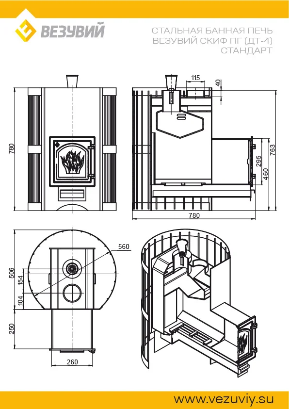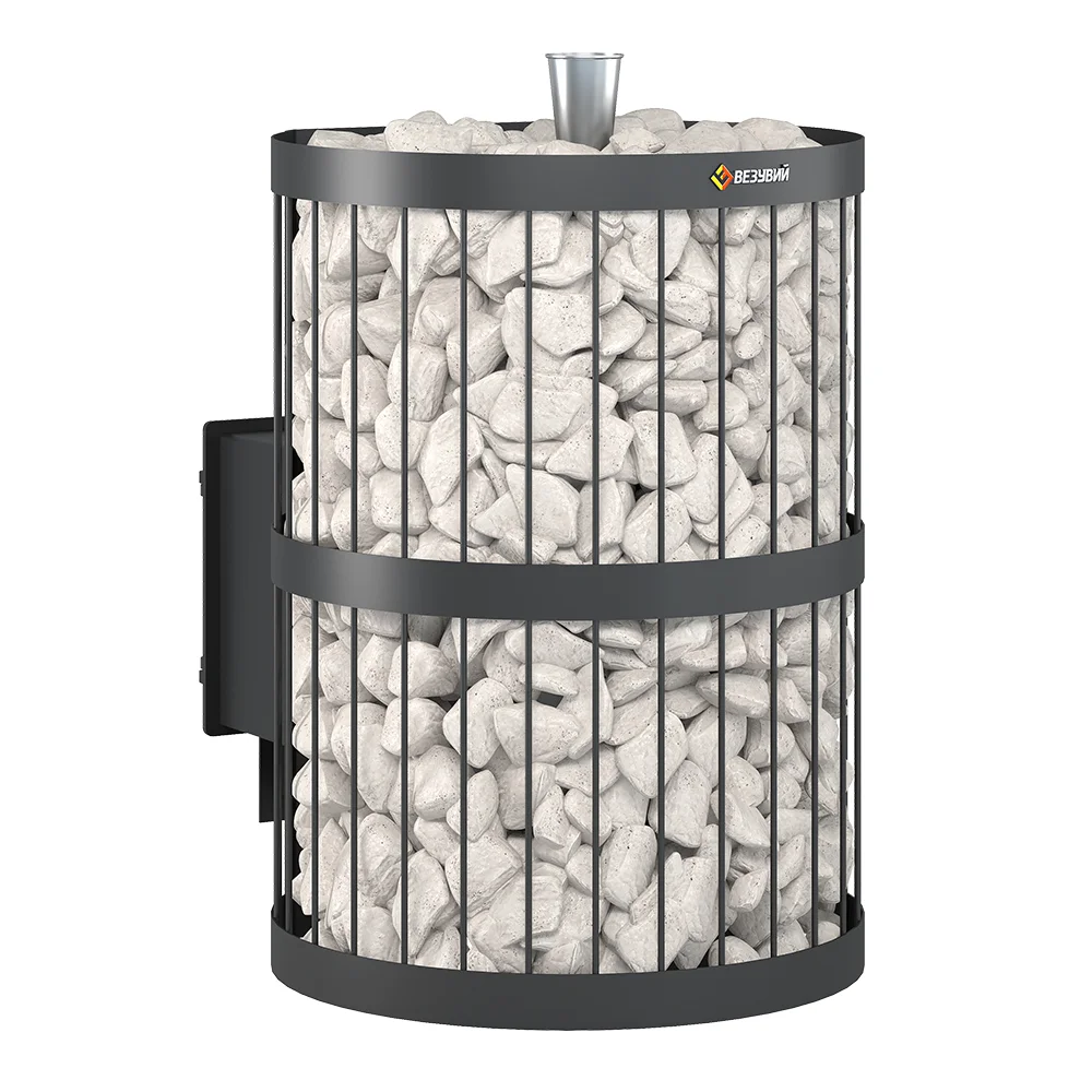 Печь изготовлена из особо прочной котловой стали 09Г2С, рассчитанной на работу при высоких температурах и давлении. Толщина стенок печи 4-6 мм. Топочный тоннель сделан из стали толщиной 4 мм, что позволяет топить дрова длиной более 50 см.Топка оснащена каналом для подачи воздуха на вторичный дожиг дымовых газов. Канал проходит по задней стенке топки снизу вверх и подаёт воздух для горения в верхние отделы топки. Такая конструкция повышает экономичность печи и увеличивает КПД агрегатаСъёмный чугунный колосник в сочетании со скошенными краями боковой части стенки облегчает уход за топкой, уборки золы и несгоревших углей.За счёт правильного расположения каменки, температура разогрева камней может достигать 500-550 градусов, что позволяет получать от печи Скиф перегретый мелкодисперсный пар. Для получения пара вода в каменку подаётся через воронку парогенератора и попадает сразу на максимально разогретые камни.Получившийся мелкодисперсный пар выходит через пароконвекторные каналы на боковых поверхностях топки. Выйдя через щелевые отверстия, пар по П-образному профилю направляется вверх, на камни открытой каменки.Печь Скиф устроена таким образом, что при заполнении сетки пар, получаемый в закрытой каменке, перегревается дважды: в самой закрытой каменке и после выхода, на камнях, размещённых в открытой части каменки. Чугунная дверь при нагревании не деформируется, сохраняет свою форму при остывании и предотвращает попадание продуктов горения на пол перед топкой.Печи Везувий СКИФ оснащаются сетками для камней. Сетки могут быть сделаны из металлического прутка или кованой стальной ленты шириной 40 мм.В сетку по всей высоте укладываются камни для бани, обеспечивая большой объём заклада и длительное удержание тепла после прогрева каменки.