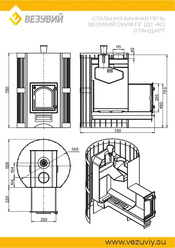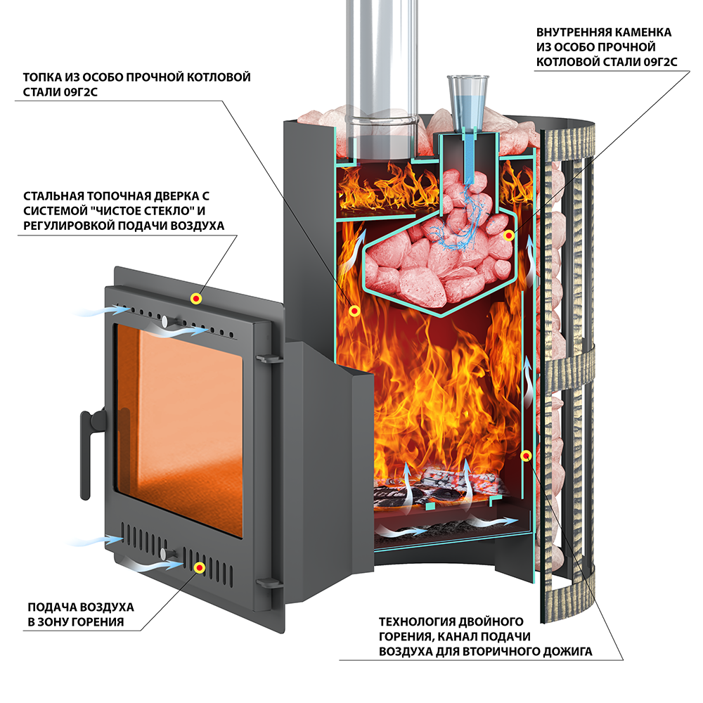 Печь изготовлена из особо прочной котловой стали 09Г2С, рассчитанной на работу при высоких температурах и давлении. Толщина стенок печи 4-6 мм. Топочный тоннель сделан из стали толщиной 4 мм, что позволяет топить дрова длиной более 50 см.Топка оснащена каналом для подачи воздуха на вторичный дожиг дымовых газов. Канал проходит по задней стенке топки снизу вверх и подаёт воздух для горения в верхние отделы топки. Такая конструкция повышает экономичность печи и увеличивает КПД агрегатаСъёмный чугунный колосник в сочетании со скошенными краями боковой части стенки облегчает уход за топкой, уборки золы и несгоревших углей.За счёт правильного расположения каменки, температура разогрева камней может достигать 500-550 градусов, что позволяет получать от печи Скиф перегретый мелкодисперсный пар. Для получения пара вода в каменку подаётся через воронку парогенератора и попадает сразу на максимально разогретые камни.Получившийся мелкодисперсный пар выходит через пароконвекторные каналы на боковых поверхностях топки. Выйдя через щелевые отверстия, пар по П-образному профилю направляется вверх, на камни открытой каменки.Печь Скиф устроена таким образом, что при заполнении сетки пар, получаемый в закрытой каменке, перегревается дважды: в самой закрытой каменке и после выхода, на камнях, размещённых в открытой части каменки. Чугунная дверь при нагревании не деформируется, сохраняет свою форму при остывании и предотвращает попадание продуктов горения на пол перед топкой.Печи Везувий СКИФ оснащаются сетками для камней. Сетки могут быть сделаны из металлического прутка или кованой стальной ленты шириной 40 мм.В сетку по всей высоте укладываются камни для бани, обеспечивая большой объём заклада и длительное удержание тепла после прогрева каменки.