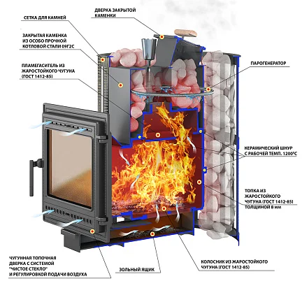 Преимущество печи в том, что она состоит из 3-х элементов. На стыке между ними используется керамический шнур с рабочей температурой 1200 градусов. То есть топка печи абсолютно герметична! Для фиксации деталей между собой применяется болтовое соединение, что даёт 100% гарантию безопасности при эксплуатации.