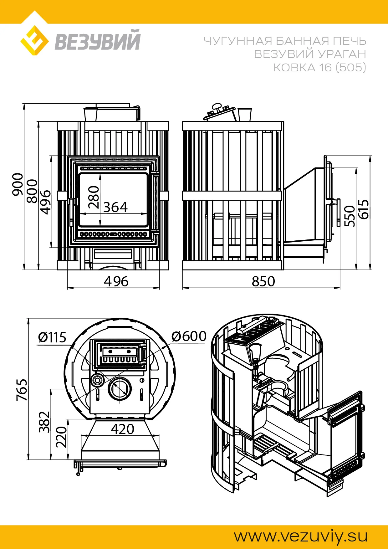 Банная чугунная печь Ураган Ковка 16 (505) укомплектована чугунной герметичной дверцей Везувий 505 с жаропрочным стеклом «SCHOTT ROBAX». Закрытая каменка изготовлена из стали и вмещает в себя не менее 60кг камней. Конвекционно-вентилируемый кожух "Ковка" изготовлен из металлической текстурированной полосы покрашенной термостойкой краской и покрытая патиной «Бронза».В конструкции данной печи предусмотрен топочный тоннель, при помощи которого печь топится из соседнего помещения, смежного с парильным.