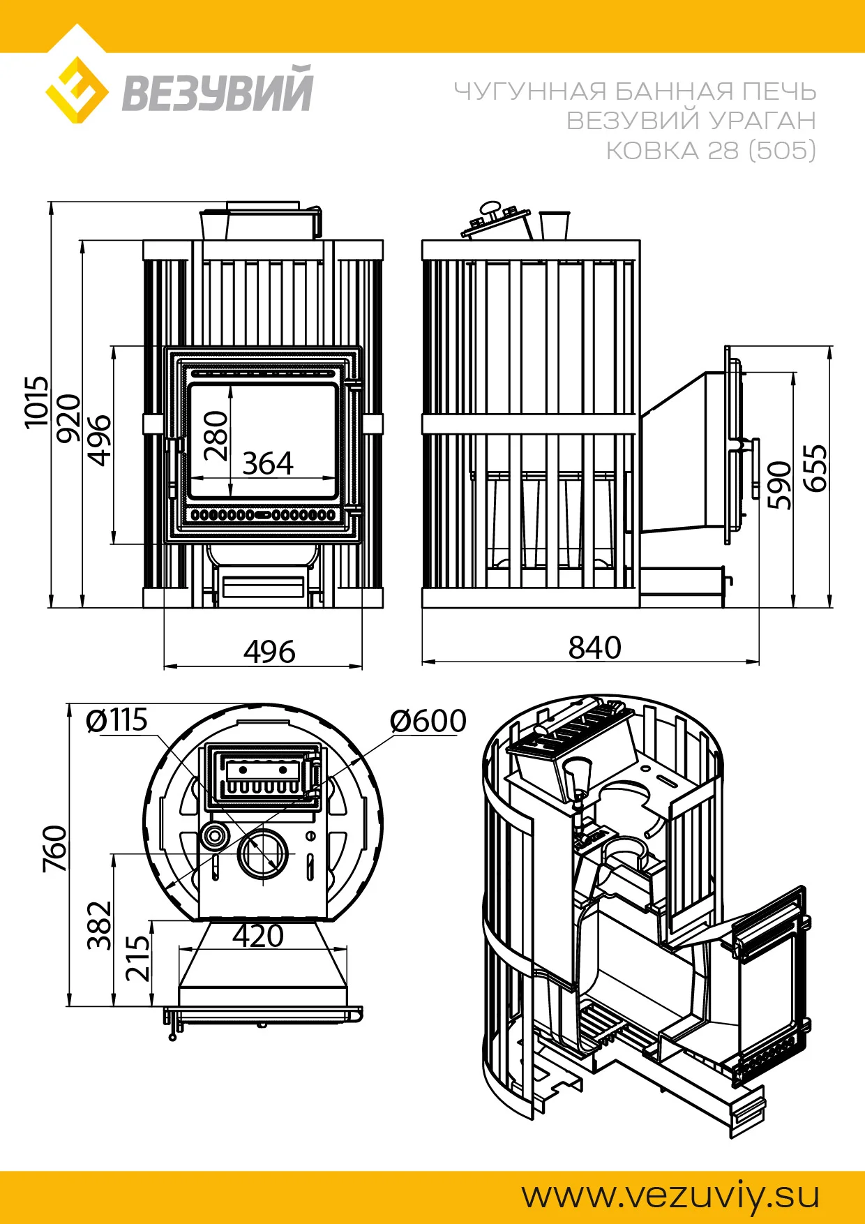 Банная чугунная печь Ураган Ковка 28 (505) укомплектована чугунной герметичной дверцей Везувий 505 с жаропрочным стеклом «SCHOTT ROBAX». Закрытая каменка изготовлена из стали и вмещает в себя не менее 60кг камней. Конвекционно-вентилируемый кожух "Ковка" изготовлен из металлической текстурированной полосы покрашенной термостойкой краской и покрытая патиной «Бронза».В конструкции данной печи предусмотрен топочный тоннель, при помощи которого печь топится из соседнего помещения, смежного с парильным.