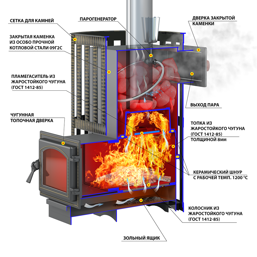 Преимущество печи в том, что она состоит из 3-х элементов. На стыке между ними используется керамический шнур с рабочей температурой 1200 градусов. То есть топка печи абсолютно герметична! Для фиксации деталей между собой применяется болтовое соединение, что даёт 100% гарантию безопасности при эксплуатации.