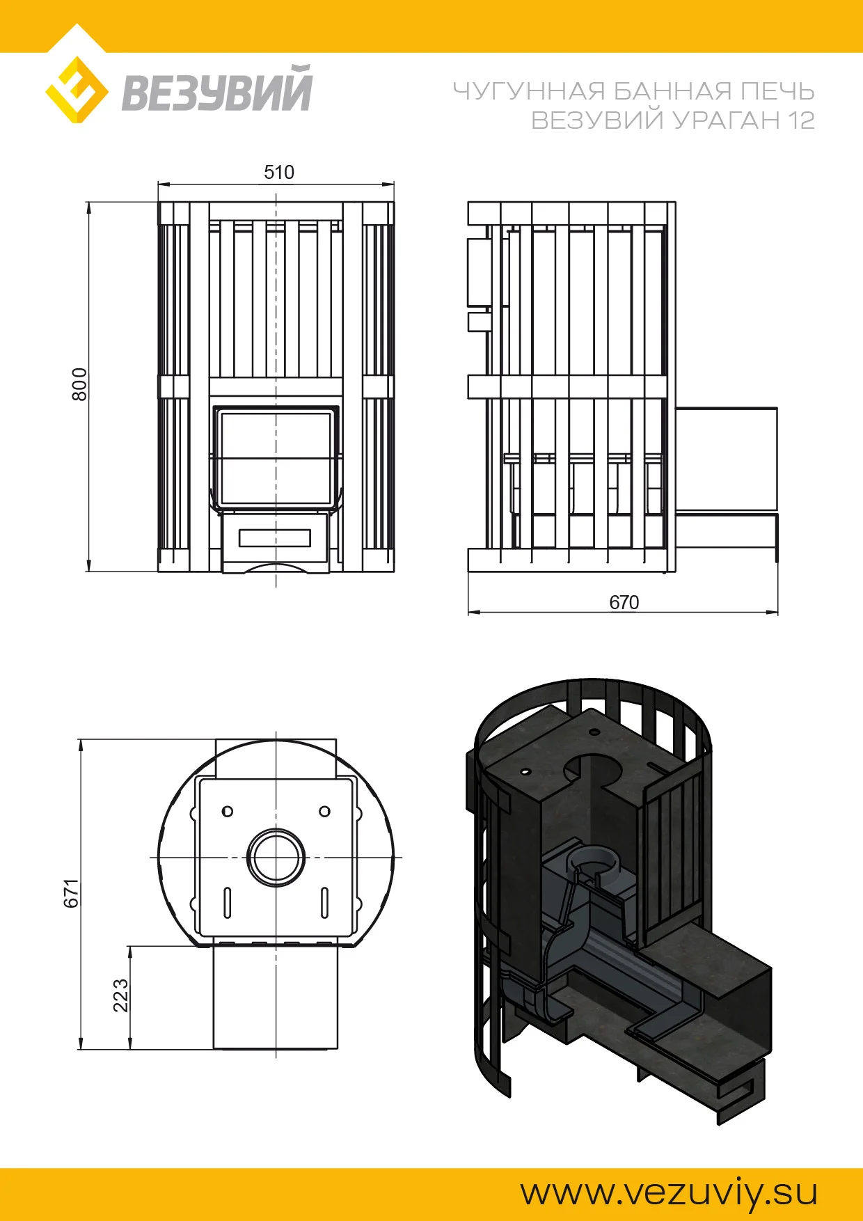 Банная чугунная печь Ураган Стандарт 12 (ДТ-3) укомплектована чугунной не герметичной дверцей Везувий ДТ-3. Закрытая каменка изготовлена из стали. Конвекционно-вентилируемый кожух "Стандарт" изготовлен из металлического прутка диаметром 6мм покрашенной черной термостойкой краской.