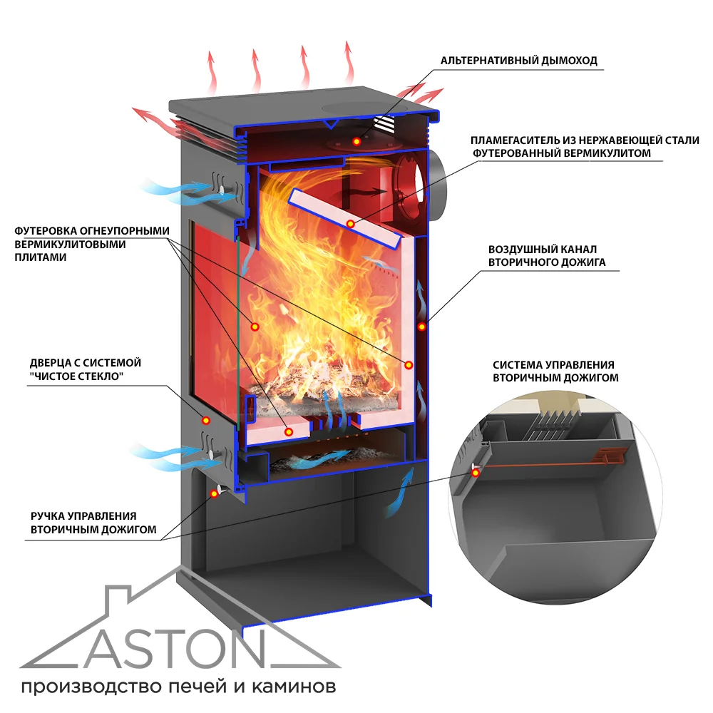 Топка камина изнутри футерована шамотным кирпичом, который защищает боковые стенки и дно топки от тепловой нагрузки. Во время топки шамот накапливает большое количество тепла, которое постепенно отдаёт в окружающее пространство. Это позволяет печи-камину АСТОН дольше оставаться тёплым и поддерживать вокруг комфортную температуру.