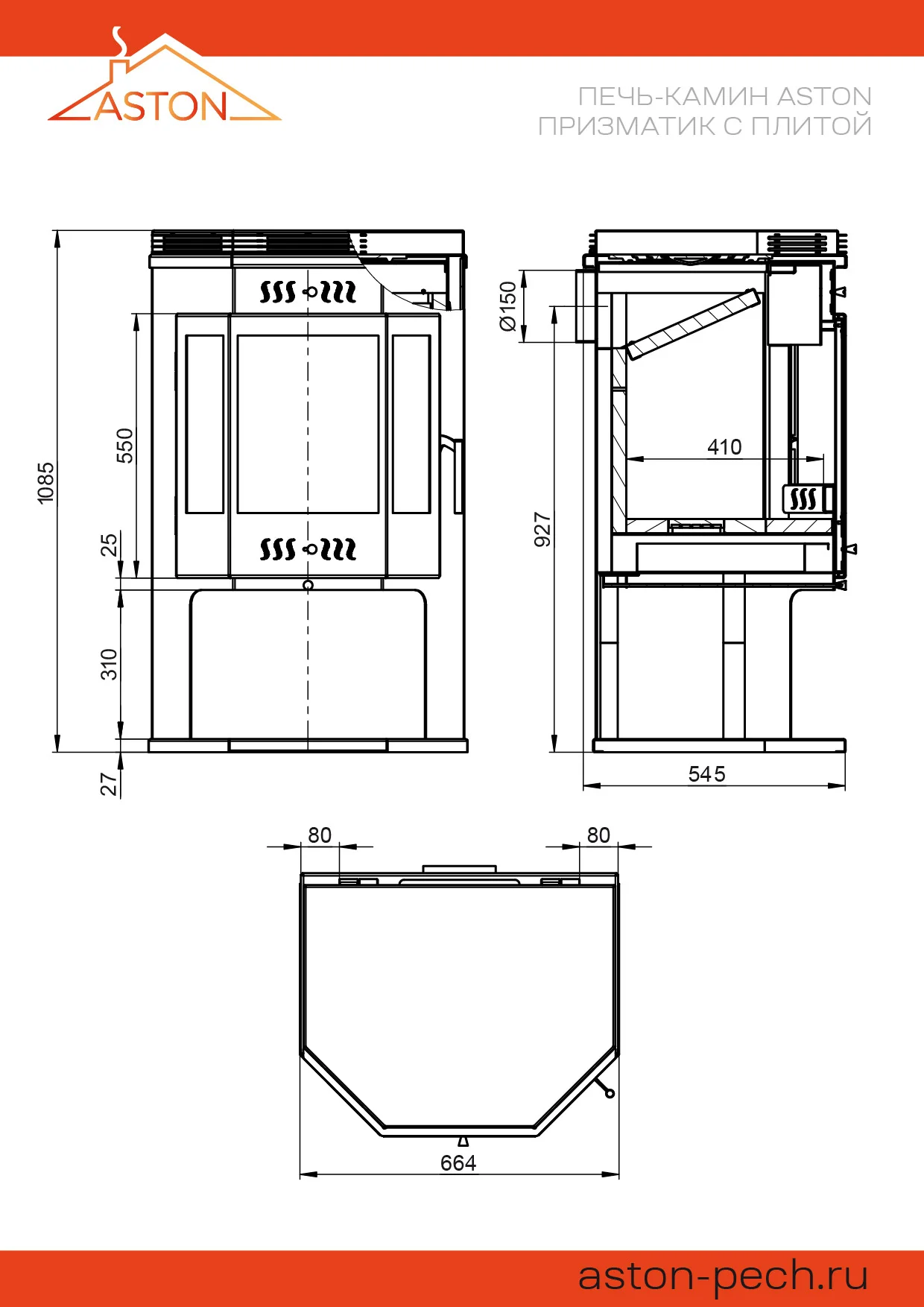 Печь-камин ASTON 12 кВт (200 м3) Призматик изготовлена из особо прочной котловой стали марки 09Г2С. Наиболее термонагруженные участки выполнены из нержавеющей стали марки AISI 430. Печь работает на дровах и рассчитана на пристенное размещение.Номинальная мощность печи – 12 кВт, что позволяет отапливать помещение объёмом до 200 м³.