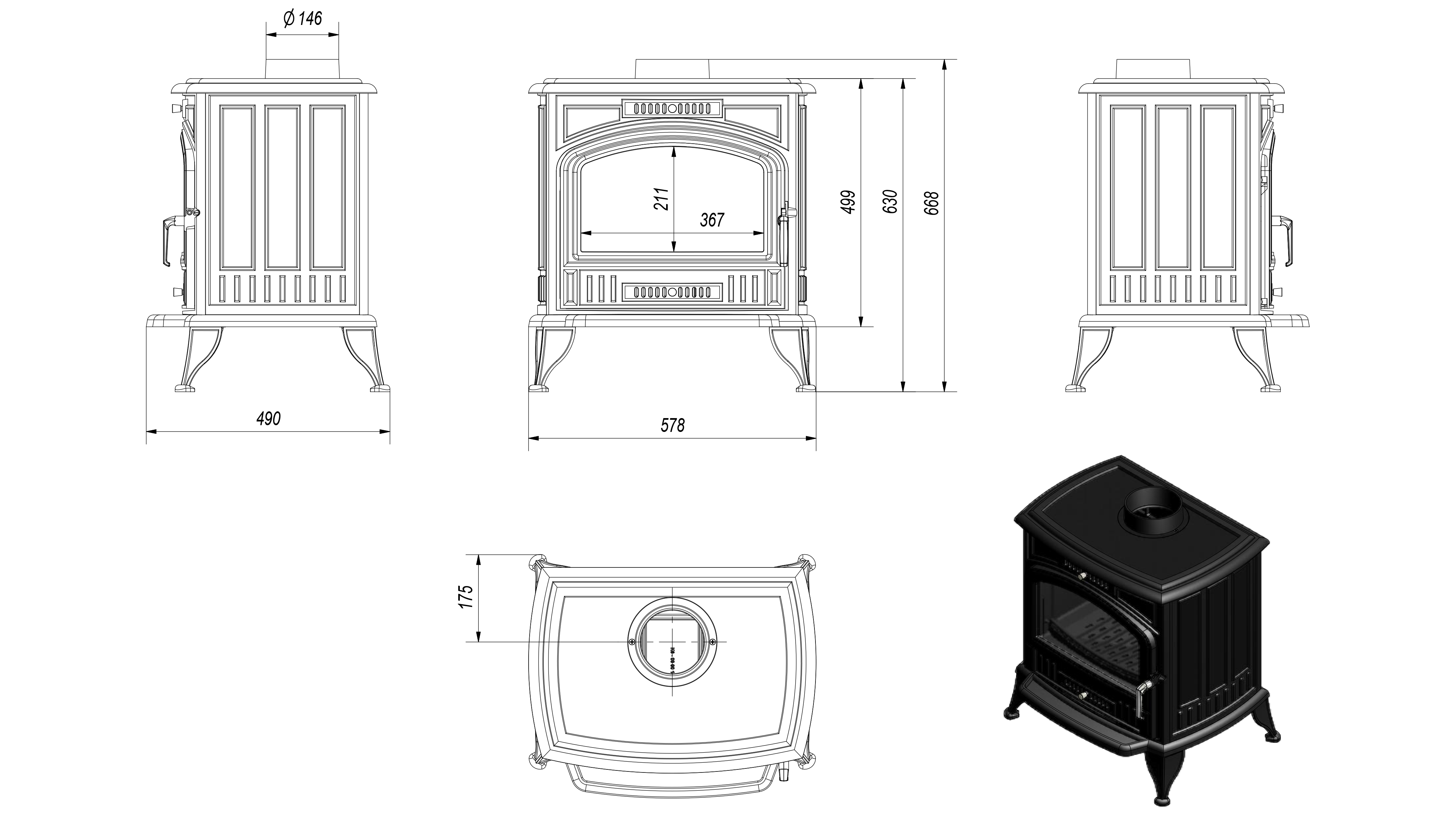 Печь изготовлена из высококачественного чугуна толщиной 8мм. Топка оснащена декоративным забором предотвращающим выпадение дров. Выдвижной зольный ящик и съемный чугунный колосник облегчают удаление золы и чистку. Стекло дверцы передаст всю красоту живого огня и при этом всегда останется чистым, благодаря специальной системе обдува.