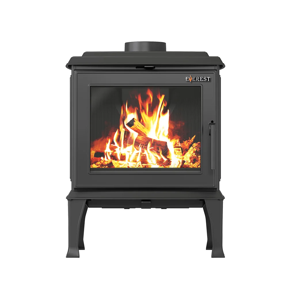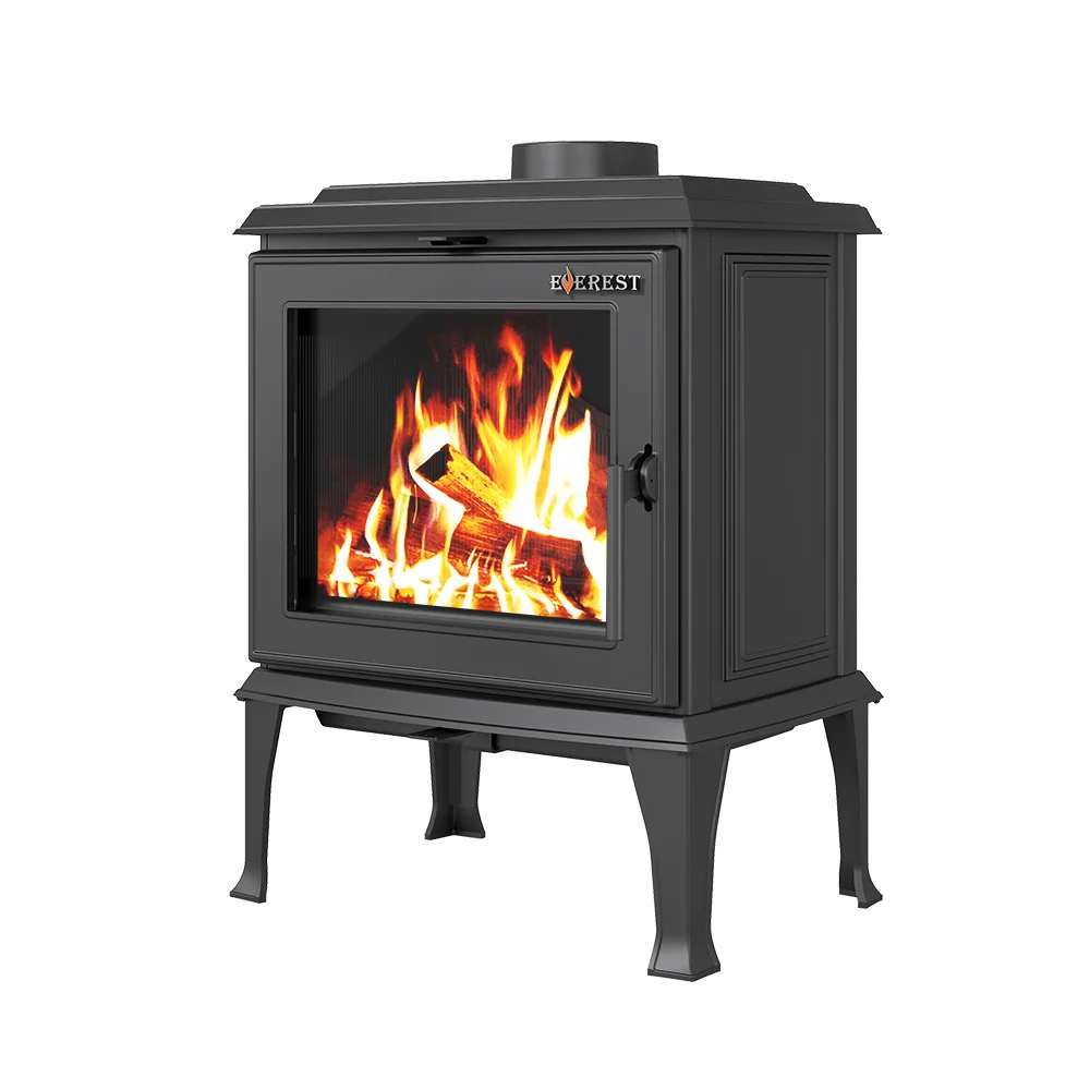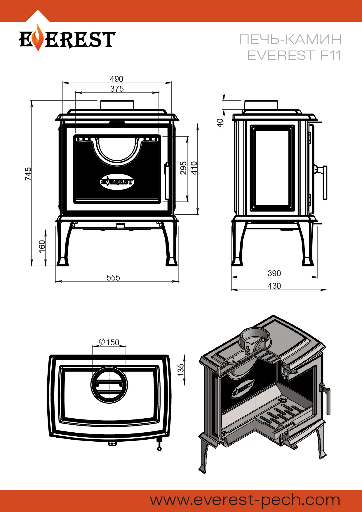 Печь-камин EVEREST F11 изготовлена из качественного жаростойкого чугуна (ГОСТ 1412-85) с толщиной стенок 6-14 мм. Вес печи составляет 130 кг. Модель рассчитана на обогрев помещений объёмом до 220 м³. Топка Печи камина усилена чугунными вставками с системой вторичного дожига. С помощью этой функции по каналам подачи вторичного воздуха поступает воздух, который нагревается при прохождении между топочной камерой и стенками корпуса. Далее нагретый воздух через дефлектор поступает в топку, перемешивается с газами - продуктами горения, чем вызывает повторное возгорание. Над дверцей печи-камина расположена система чистое стекло, которая помогает оставаться стеклу чистым. В нижней части дверцы расположена ручка для регулировки подачи воздуха в колосниковую зону. Патрубок дымохода Ø 150мм – универсальный, со сменным положением. Он может быть установлен сверху или сзади в зависимости от размещения печи в помещении.