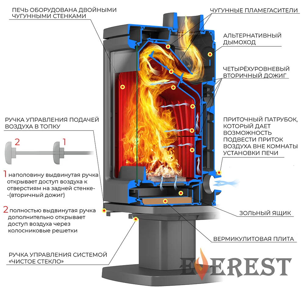 Печь-камин имеет два чугунных пламегасителя, обеспечивающие высокий КПД печи. Топка печи-камина усилена чугунными вставками с системой четырехуровневого вторичного дожига. С помощью этой функции по каналам подачи вторичного воздуха поступает воздух, который нагревается при прохождении между топочной камерой и стенками корпуса. Далее нагретый воздух через дефлектор поступает в топку, перемешивается с газами - продуктами горения, чем вызывает повторное возгорание. Регулировка этой системы, как и подача воздуха в колосниковую зону осуществляется рычагом, расположенным слева в нижней части печи-камина. В правой нижней части расположена ручка регулировки системы чистое стекло, которая препятствует оседанию сажи на внутреннюю поверхность стекла.
