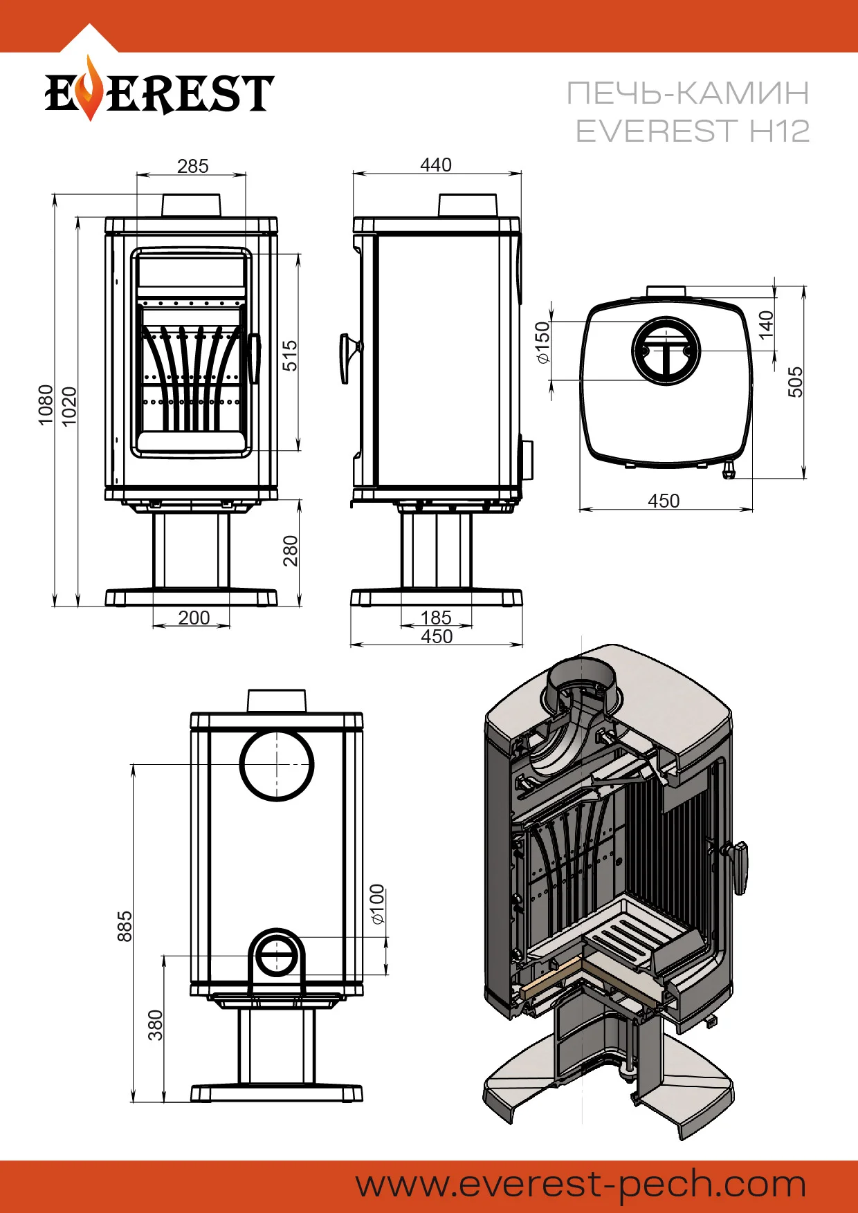 Печь-камин EVEREST H12/ Н12М изготовлена из качественного жаростойкого чугуна с толщиной стенок 6-8мм. Вес печи составляет 182 кг. Модель рассчитана на обогрев помещений объёмом до 240м³.