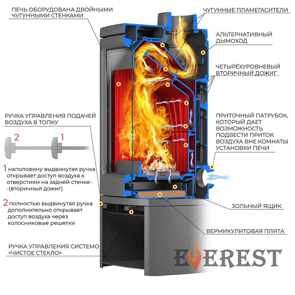Печь-камин имеет два чугунных пламегасителя, обеспечивающие высокий КПД печи. Топка печи-камина усилена чугунными вставками с системой четырехуровневого вторичного дожига. С помощью этой функции по каналам подачи вторичного воздуха поступает воздух, который нагревается при прохождении между топочной камерой и стенками корпуса. Далее нагретый воздух через дефлектор поступает в топку, перемешивается с газами - продуктами горения, чем вызывает повторное возгорание. Регулировка этой системы, как и подача воздуха в колосниковую зону осуществляется рычагом, расположенным слева в нижней части печи-камина. В правой нижней части расположена ручка регулировки системы чистое стекло, которая препятствует оседанию сажи на внутреннюю поверхность стекла.