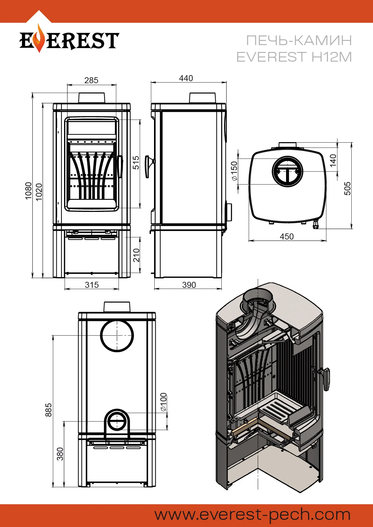 Печь-камин EVEREST H12/ Н12М изготовлена из качественного жаростойкого чугуна с толщиной стенок 6-8мм. Вес печи составляет 175 кг. Модель рассчитана на обогрев помещений объёмом до 240м³.