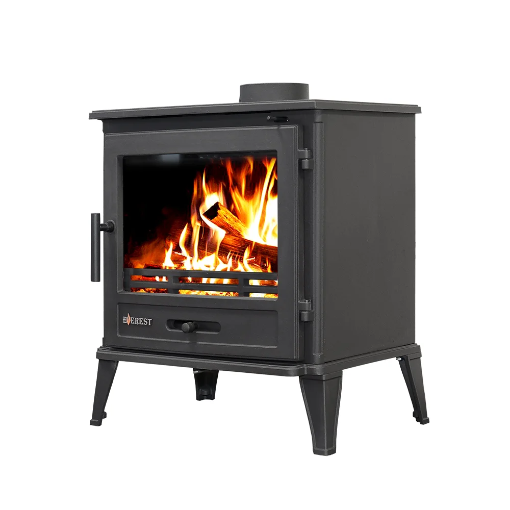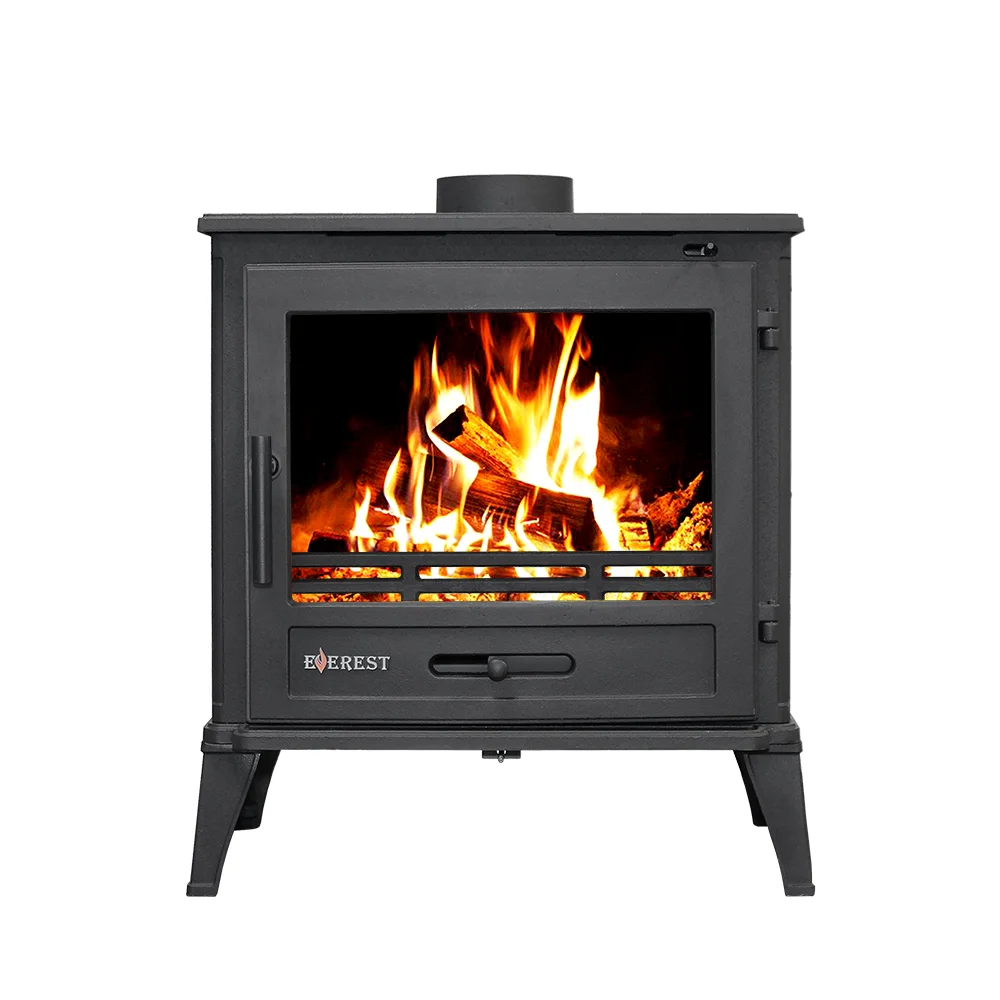 Печь-камин EVEREST М10 изготовлена из качественного жаростойкого чугуна с толщиной стенок 6-8 мм. Модель рассчитана на обогрев помещений объёмом до 200м³. Печь-камин имеет два пламегасителя: самый нагруженный пламегаситель изготовлен из вермикулита, второй из жаростойкого чугуна. Топка печи-камина усилена вермикулитовыми плитами с системой двухуровневого вторичного дожига. С помощью этой функции по каналам подачи вторичного воздуха поступает воздух, который нагревается при прохождении между топочной камерой и стенками корпуса. Далее нагретый воздух через дефлектор поступает в топку, перемешивается с газами - продуктами горения, чем вызывает повторное возгорание. Регулировка этой системы, как и подача воздуха в колосниковую зону, осуществляется заслонкой, расположенной в нижней части печи-камина. Регулировка подачи воздуха в колосниковую зону осуществляется заслонкой , расположенной на двери. В верхней части расположена ручка регулировки системы чистое стекло, которая помогает оставаться стеклу чистым. Патрубок дымохода Ø 150мм – универсальный, со сменным положением. Он может быть установлен сверху или сзади в зависимости от размещения печи в помещении.