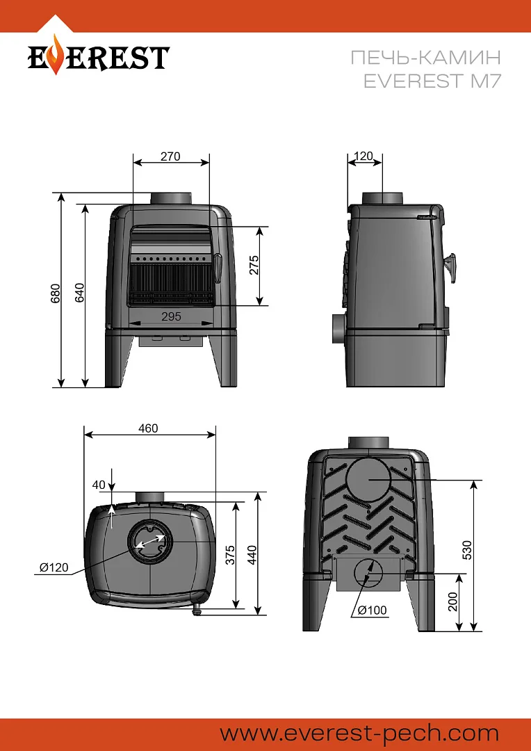 Печь-камин EVEREST М7 изготовлена из качественного жаростойкого чугуна с толщиной стенок 6-8 мм. Модель рассчитана на обогрев помещений объёмом до 140м³. Печь-камин имеет два пламегасителя: самый нагруженный пламегаситель изготовлен из чугуна, второй из стали 09Г2С. Топка печи-камина усилена чугунными плитами с системой двухуровневого вторичного дожига. С помощью этой функции по каналам подачи вторичного воздуха поступает воздух, который нагревается при прохождении между топочной камерой и стенками корпуса. Далее нагретый воздух через дефлектор поступает в топку, перемешивается с газами - продуктами горения, чем вызывает повторное возгорание. Регулировка этой системы, как и подача воздуха в систему чистое стекло, осуществляется заслонкой, расположенной слева в нижней части печи-камина. В правой нижней части расположена ручка регулировки подача воздуха в колосниковую зону. Патрубок дымохода Ø 120мм – универсальный, со сменным положением. Он может быть установлен сверху или сзади в зависимости от размещения печи в помещении. На задней стенке расположен приточный патрубок, который дает возможность подвести приток воздуха вне комнаты.