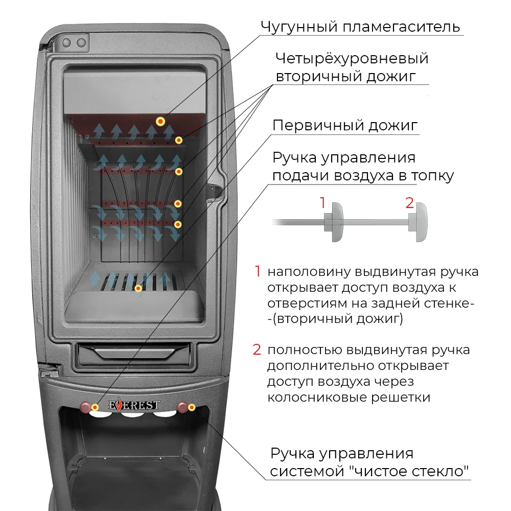 Печь-камин имеет два чугунных пламегасителя, обеспечивающие высокий КПД печи. Топка печи-камина усилена чугунными вставками с системой четырехуровневого вторичного дожига. С помощью этой функции по каналам подачи вторичного воздуха поступает воздух, который нагревается при прохождении между топочной камерой и стенками корпуса. Далее нагретый воздух через дефлектор поступает в топку, перемешивается с газами - продуктами горения, чем вызывает повторное возгорание. Регулировка этой системы, как и подача воздуха в колосниковую зону осуществляется рычагом, расположенным слева в нижней части печи-камина. В правой нижней части расположена ручка регулировки системы чистое стекло, которая препятствует оседанию сажи на внутреннюю поверхность стекла.