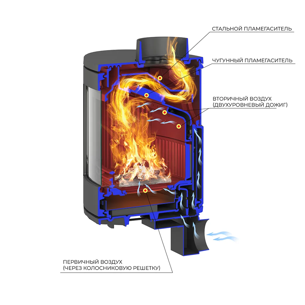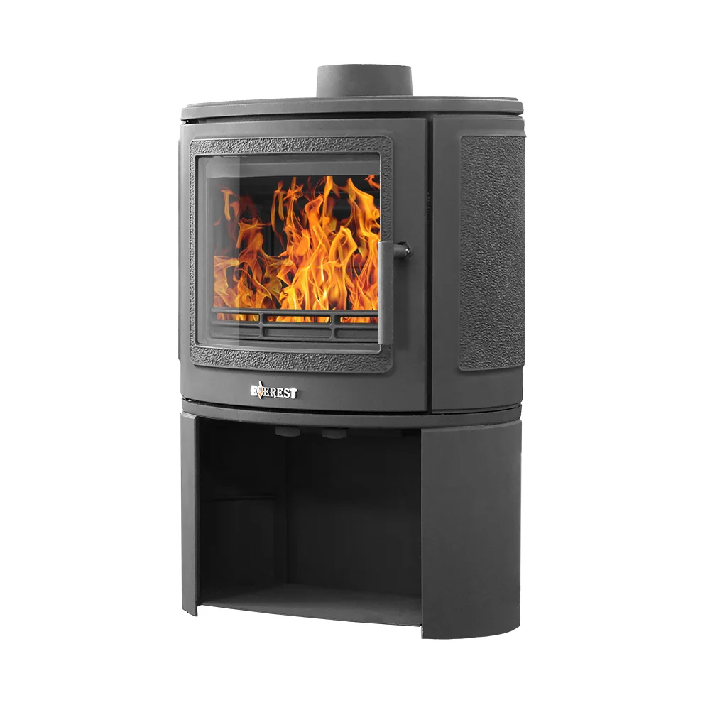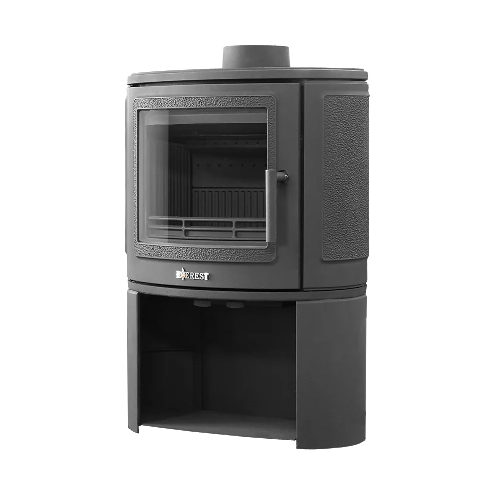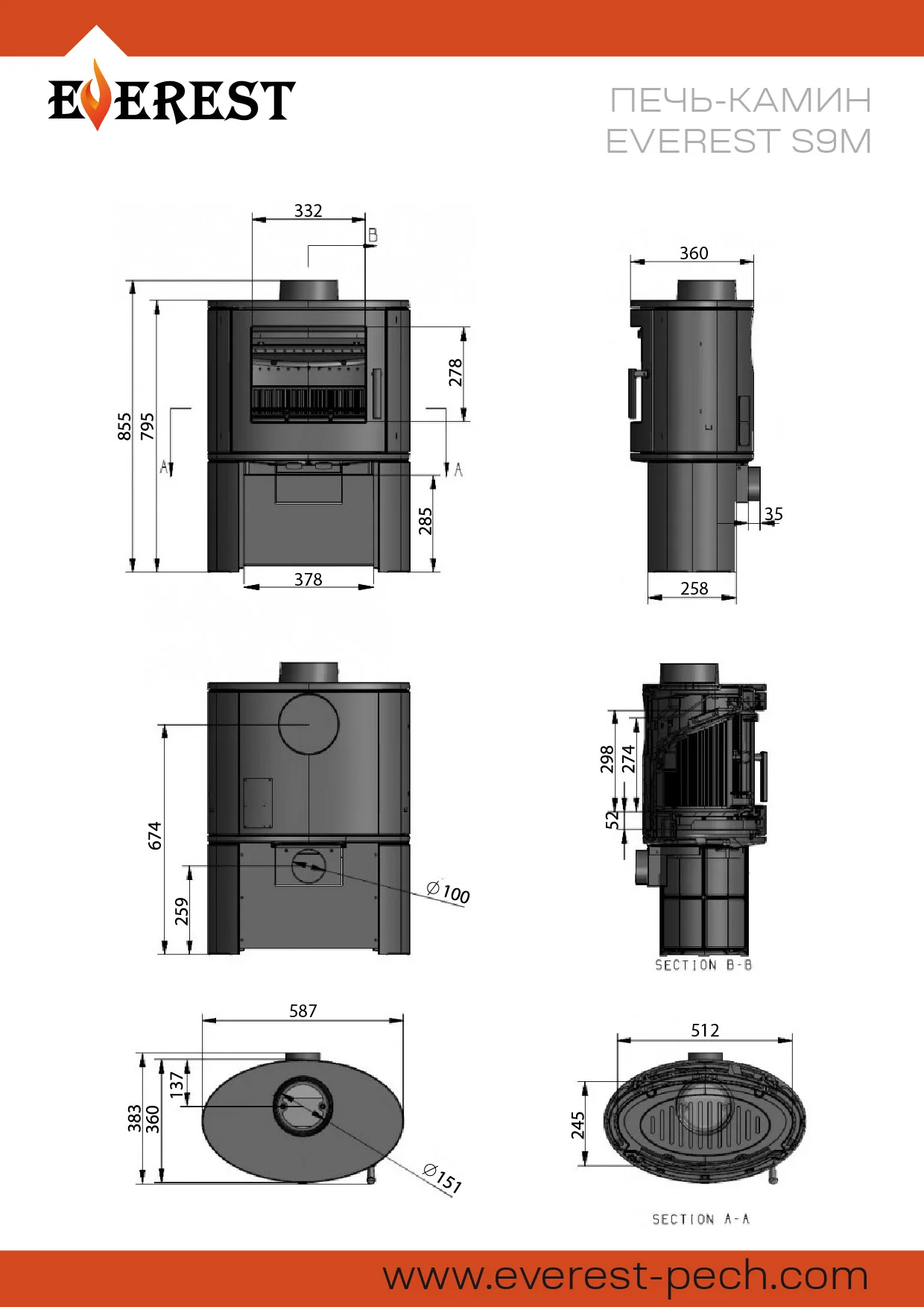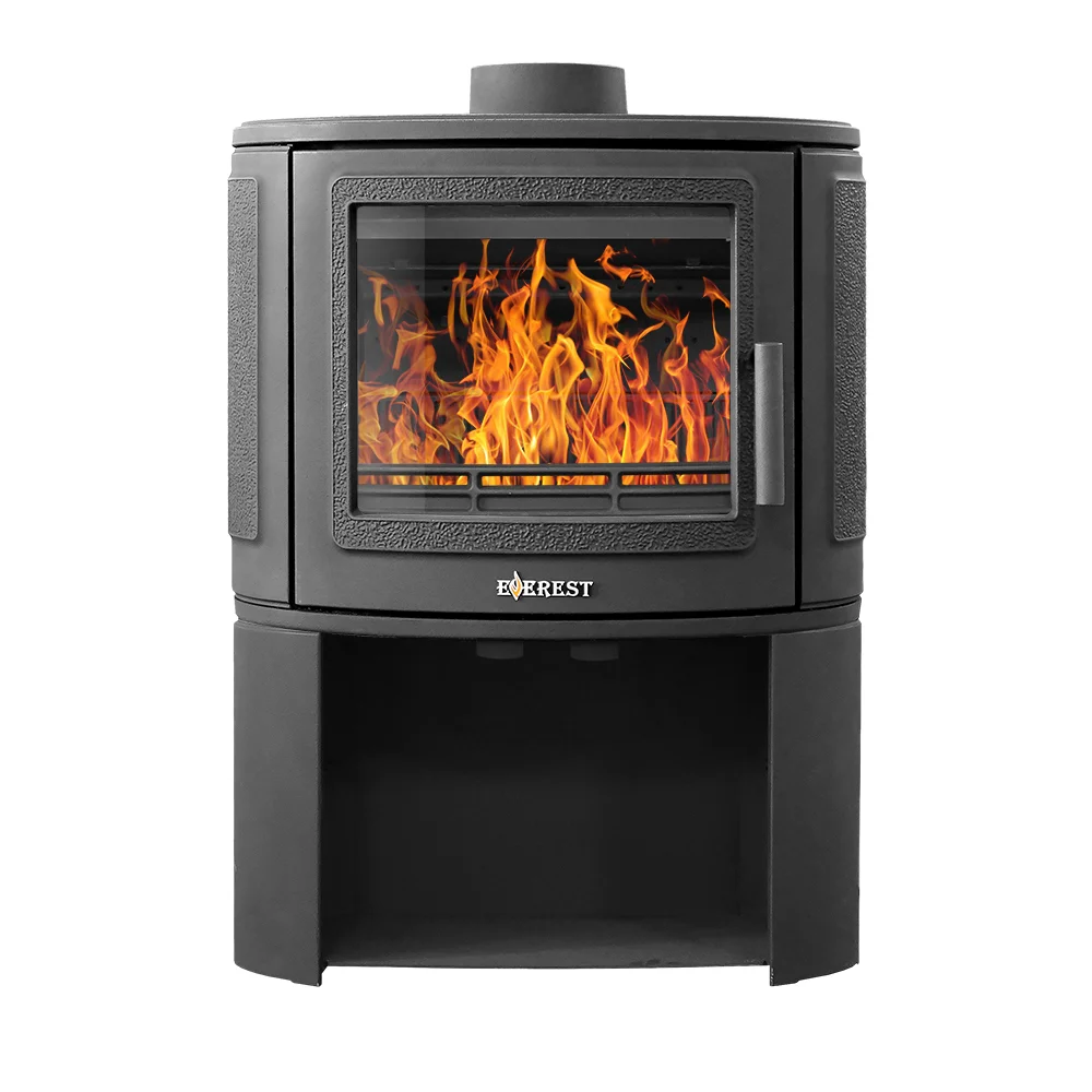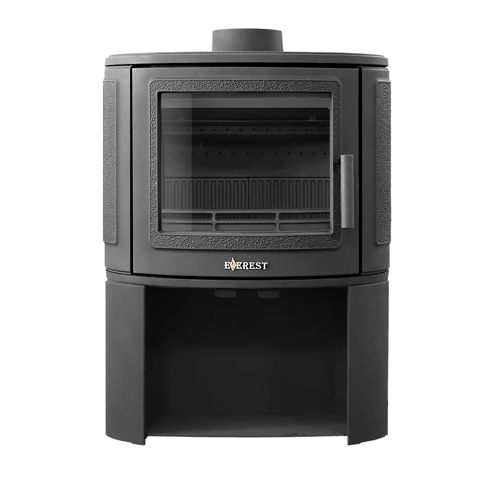 Печь-камин EVEREST S9 и S9M изготовлена из качественного жаростойкого чугуна с толщиной стенок 6-8 мм. Модель рассчитана на обогрев помещений объёмом до 180м³. Печь-камин имеет два пламегасителя: самый нагруженный пламегаситель изготовлен из жаростойкого чугуна (ГОСТ 1412-85), второй из особо прочной котловой стали 09Г2С. Топка печи-камина усилена чугунными вставками с системой двухуровневого вторичного дожига. С помощью этой функции по каналам подачи вторичного воздуха поступает воздух, который нагревается при прохождении между топочной камерой и стенками корпуса. Далее нагретый воздух через дефлектор поступает в топку, перемешивается с газами - продуктами горения, чем вызывает повторное возгорание. Регулировка этой системы, как и подача воздуха в колосниковую зону, осуществляется рычагом, расположенным слева в нижней части печи-камина. В правой нижней части расположена ручка регулировки системы чистое стекло, которая помогает оставаться стеклу чистым. Патрубок дымохода Ø 150мм – универсальный, со сменным положением. Он может быть установлен сверху или сзади в зависимости от размещения печи в помещении. На задней стенке расположен приточный патрубок, который дает возможность подвести приток воздуха вне комнаты.