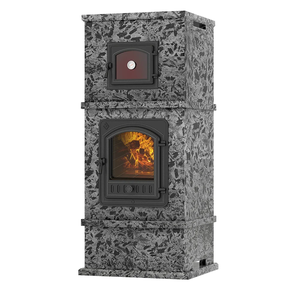 Печь-камин EVEREST сделана из качественного чугуна по ГОСТ 1412-85. Конструкция печи-камина двухкамерная, с вертикальным расположением камер. Встроенная духовка может быть использована для выпечки, тушения, разогрева еды.Нижняя топочная камера предназначена для горения топлива, выполнена в виде куба с одним швом по середине топки. Такое соединение по типу «паз-гребень» заметно повышает прочность и надёжность печи-камина.Дверь печи-камина с большим стеклом (диагональ 35 см) оснащена системой регулировки подачи воздуха в колосниковую зону. С помощью задвижки на внутренней стороне двери можно увеличивать или уменьшать интенсивность горения топлива в топочной камере.Толщина чугуна на стенках топки варьируется от 8 до 20 мм в зависимости от того, насколько термонапряжённым является участок стенки топки. Снаружи топочная камера имеет оребрение по всей площади стенок, что усиливает теплоотдачу и способствует высокой эффективности работы печи.Большой чугунный колосник и стальной зольный ящик позволяют удобно ухаживать за топочным пространством и не препятствуют поступлению воздуха в топку.Над топочной камерой размещена верхняя часть печи, в которую встроен духовой шкаф. Потоки пламени и разогретые газы из топки поднимаются вверх, со всех сторон обтекают духовку и позволяют разогревать её до высоких температур.Духовка сделана из нержавеющей стали, применяемой в пищевой промышленности. В верхнем модуле установлены чугунные кольца. Духовка не контактирует с огнём, прогревается за счёт нагревания воздуха внутри колец.Дверь духовки -- чугунная, остеклённая. Широкое стекло позволяет наблюдать за процессом приготовления и контролировать состояние продуктов. В средней части стекла установлен термометр, на котором в градусах по Цельсию или Фаренгейту отражается температура воздуха внутри духового шкафа.Печь-камин подключается к дымоходу диаметром 120 мм. Патрубок дымохода размещается сверху.Печь-камин EVEREST с духовкой может быть облицована кирпичом или устанавливаться в облицовку из натурального камня.Большой вес печи гарантирует её высокую теплоёмкость, а дополнительная теплоаккумулирующая облицовка хорошо распределяет накопленную энергию и поддерживает в помещении достаточный тепловой комфорт.