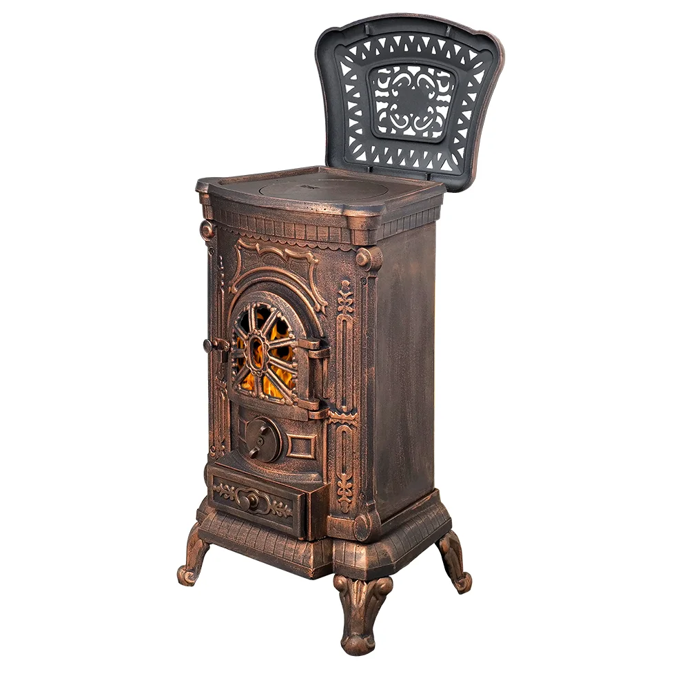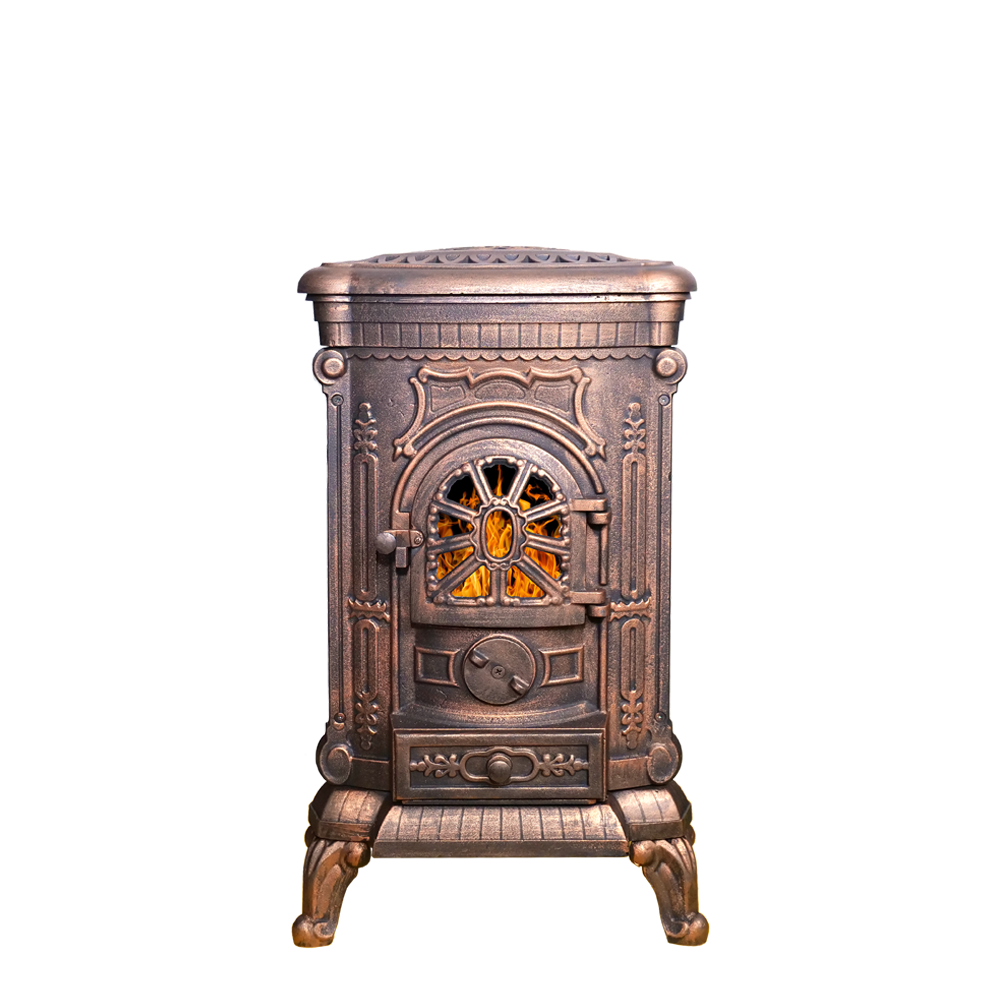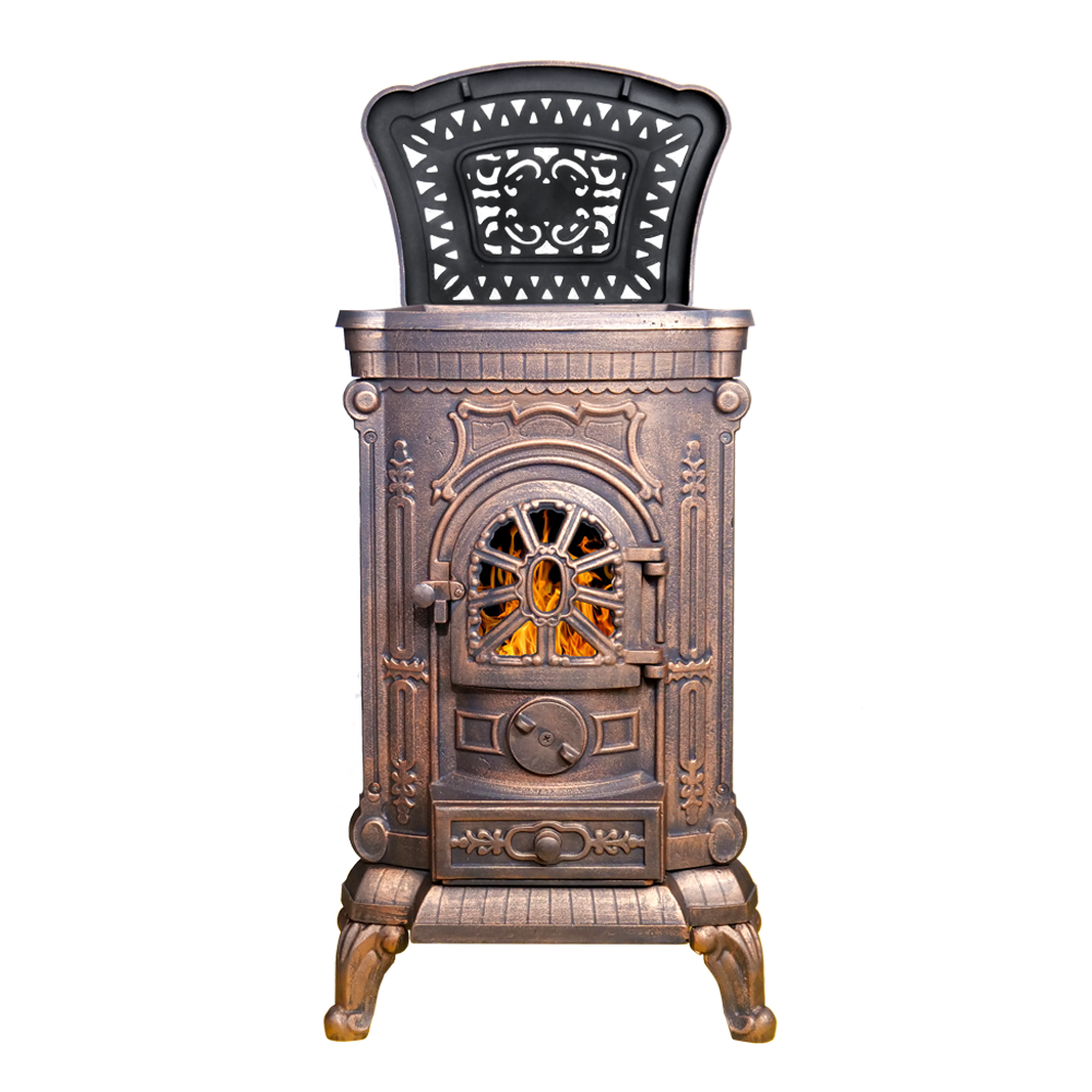 Пространство топки со всех сторон ограничено чугунными стенками.Верхняя панель толщиной 6 мм оснащена варочной конфоркой диаметром 23 см. Конфорка – съёмная, и при приготовлении пищи может быть убрана для размещения металлической посуды без ровного дна (например, небольшого казана). При снятой конфорке нагрев посуды проходит быстрее, что ускоряет приготовление еды.Небольшой бортик по периметру верхней панели предотвращает попадание пролившихся жидкостей на боковые стенки печи.В то время, когда вы не пользуетесь конфоркой, верхняя панель печи прикрывается литой узорной крышкой из чугуна.Чугунный пламегаситель – съёмный, устанавливается на небольшие отливы, выступающие в пространство топки в её верхней части. Форма и размер пламегасителя рассчитаны на максимальное удлинение пути пламени. Работа этого элемента топки направлена на повышение эффективности сгорания топлива и дымовых газов.Сама колосниковая плита одновременно выполняет роль нижней стенки топочной камеры. В ней прорезаны колосниковые щели, через которые первичный воздух для горения поступает в топку.Объём подаваемого воздуха регулируется за счёт вращения округлой рукоятки на передней поверхности печи. Рукоятка в закрытом виде закрывает отверстия для подачи воздуха на горение. Выкручивая рукоятку, мы увеличиваем поступление воздуха в топочную камеру и усиливаем горение дров.Топка глубиной 25 см рассчитана на небольшие дрова или брикеты. В положении стоя в топку войдут дрова длиной до 30 см.Коробчатый зольный ящик размещается ниже двери печи. Он сделан из стали, а передняя стенка – чугунная, выполнена в дизайне, схожем с общим дизайном печи А-07. Ящик полностью заполняет поддувальное пространство, обеспечивая чистоту и порядок. С помощью ящика быстро и удобно удалять из печи золу и несгоревшие угли.Дверь печи А-07 – чугунная, с термостойким стеклом диагональю 19 см. Стекло спереди защищено фигурной литьевой решёткой, которая придаёт двери внешний вид, схожий с витражом.Конструкция дверного запора простая, но при полном закрытии он обеспечивает притягивание полотна двери к рамке. В сочетании с керамическим шнуром по периметру двери ручка помогает добиться максимальной газоплотности топочного пространства.Патрубок дымохода диаметром 115 мм размещается на задней стенке печи. Такое размещение точки выхода дымовых газов совместно с работой пламегасителя позволяет максимально эффективно получать энергию горящих дров и обеспечивает высокий КПД печи.Небольшая масса печи в 79 кг позволяет устанавливать её без дополнительного подкрепления полов.Изящный дизайн с фигурной отделкой удачно впишется в интерьер с самыми разными стилями.