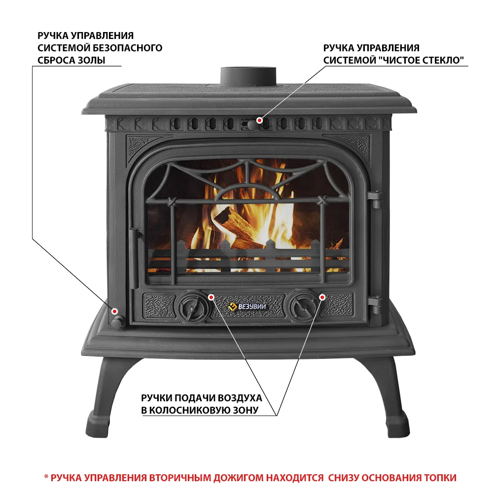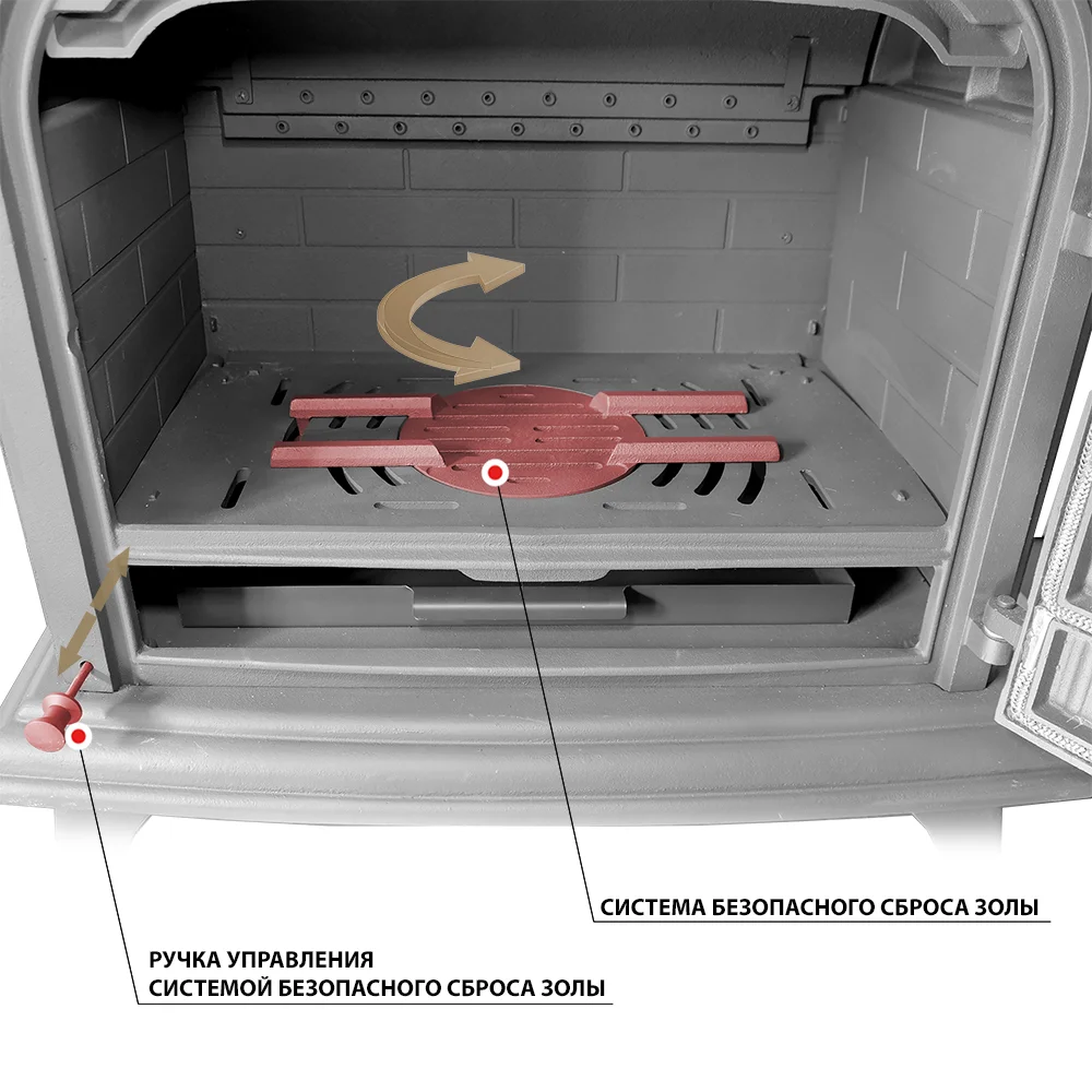Над дверцей печи-камина расположена система чистое стекло, которая помогает оставаться стеклу чистым. В нижней части дверцы расположены две ручки для регулировки подачи воздуха в колосниковую зону, которые помогают контролировать интенсивность горения. В нижней панели предусмотрена колосниковая решётка.