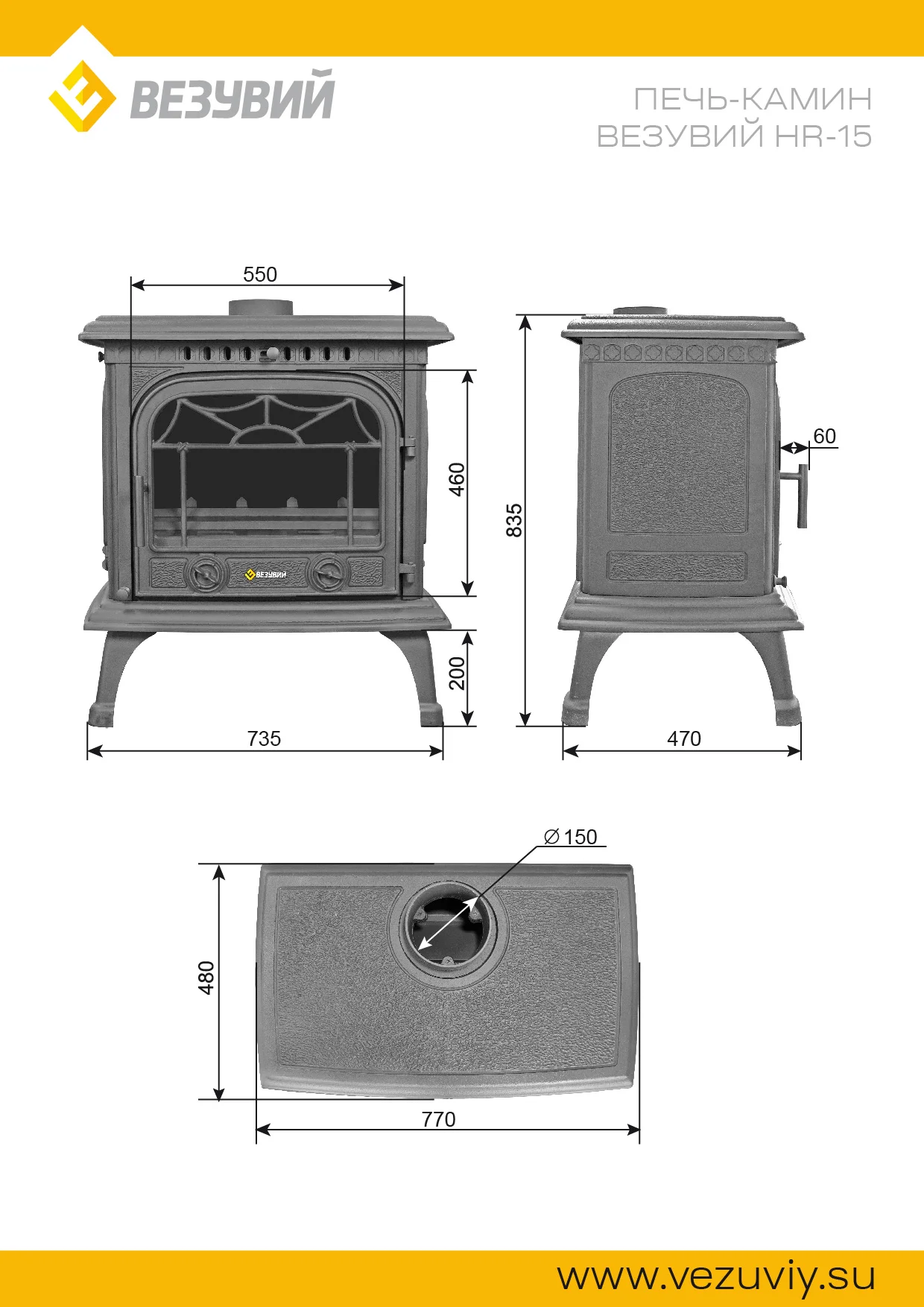 Печь-камин Везувий HR-15P изготовлена из качественного жаростойкого чугуна с толщиной стенок 6-8 мм. Модель рассчитана на обогрев помещений объёмом до 250 м³.