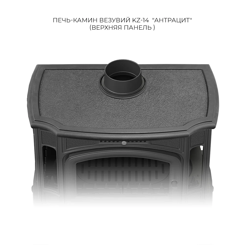Печь-камин Везувий KZ-14 изготовлена из качественного чугуна с толщиной стенки 8-10 мм. Модель рассчитана на обогрев помещений объёмом до 280 м?.Топочная камера с двойными чугунными стенками. В нижней панели предусмотрена колосниковая решётка. Дверь изготовлена из чугуна и оснащена большим панорамным стеклом в виде арки. С двух сторон от двери установлены две стеклянные вставки. На модели KZ-14Р по бокам установлены стекла. Чистота стекла во время работы обеспечивается системой подачи воздуха на внутреннюю сторону стекла. Воздух отсекает дымовые газы и пламя от поверхности стекла, предотвращая закопчение и потемнение стекла. На моделях KZ-14 , KZ-14S Ручка управления системой размещена в верхней части передней панели, над дверью у KZ-14Р с боку над стеклом. В нижней части двери размещена ручка задвижки для подачи воздуха на первичное горение. Вторичный дожиг в печи-камине обеспечивается двойной задней стенкой: здесь между стенкой и внутренней облицовкой топки из чугуна есть канал, идущий из поддувала под нижний край пламегасителя, в зону активного горения. Воздух для вторичного дожига поступает в верхнюю часть топки, усиливая горение и повышая теплоотдачу. Вторичный дожиг регулируется заслонкой, расположенной на задней стенке печи-камина. Ручка управления заслонкой находится справа. Зольный ящик коробчатого типа изготовлен из стали и закрывает пространство под колосниковой решёткой. Патрубок дымохода – универсальный, со сменным положением. Он может быть установлен сверху или сзади, в зависимости от размещения печи в помещении.