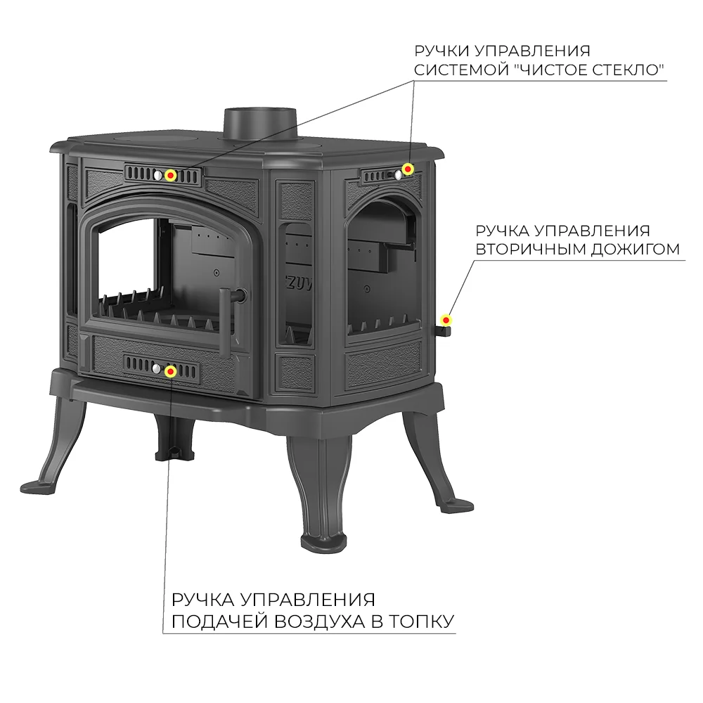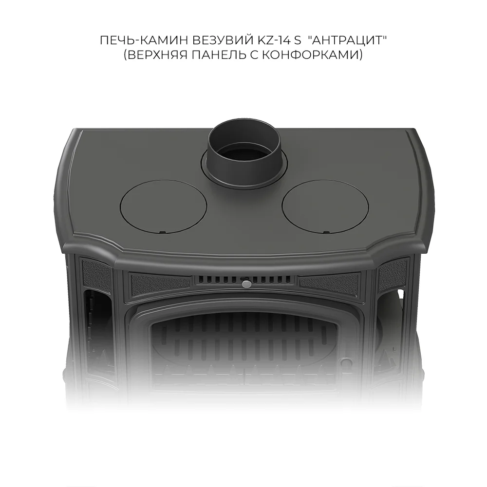 Печь-камин Везувий KZ-14SР "Антрацит" изготовлена из качественного чугуна с толщиной стенки 8-10 мм. Модель рассчитана на обогрев помещений объёмом до 280 м³.Топочная камера с двойными чугунными стенками. В нижней панели предусмотрена колосниковая решётка. Дверь изготовлена из чугуна и оснащена большим панорамным стеклом в виде арки. С двух сторон от двери установлены две стеклянные вставки. На модели KZ-14Р по бокам установлены стекла. Чистота стекла во время работы обеспечивается системой подачи воздуха на внутреннюю сторону стекла. Воздух отсекает дымовые газы и пламя от поверхности стекла, предотвращая закопчение и потемнение стекла. На моделях KZ-14 , KZ-14S ручка управления системой размещена в верхней части передней панели, над дверью у KZ-14Р с боку над стеклом. В нижней части двери размещена ручка задвижки для подачи воздуха на первичное горение. Вторичный дожиг в печи-камине обеспечивается двойной задней стенкой: здесь между стенкой и внутренней облицовкой топки из чугуна есть канал, идущий из поддувала под нижний край пламегасителя, в зону активного горения. Воздух для вторичного дожига поступает в верхнюю часть топки, усиливая горение и повышая теплоотдачу. Вторичный дожиг регулируется заслонкой, расположенной на задней стенке печи-камина. Ручка управления заслонкой находится справа. Зольный ящик коробчатого типа изготовлен из стали и закрывает пространство под колосниковой решёткой. Патрубок дымохода – универсальный, со сменным положением. Он может быть установлен сверху или сзади, в зависимости от размещения печи в помещении.
